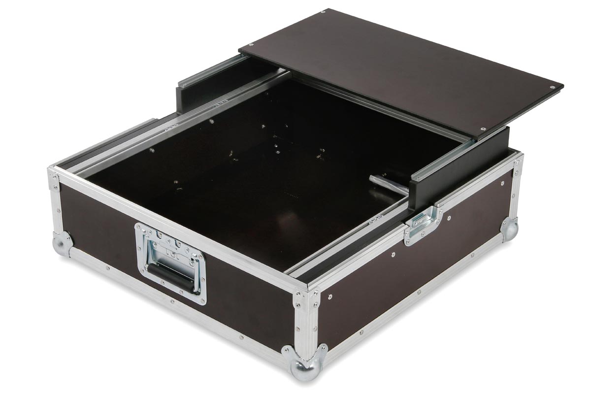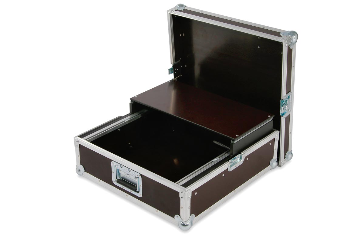 Koffer zum Einbau von 19“ Geräten. Ein Schlittenauszug mit Ablage befindet sich direkt über der Technik.