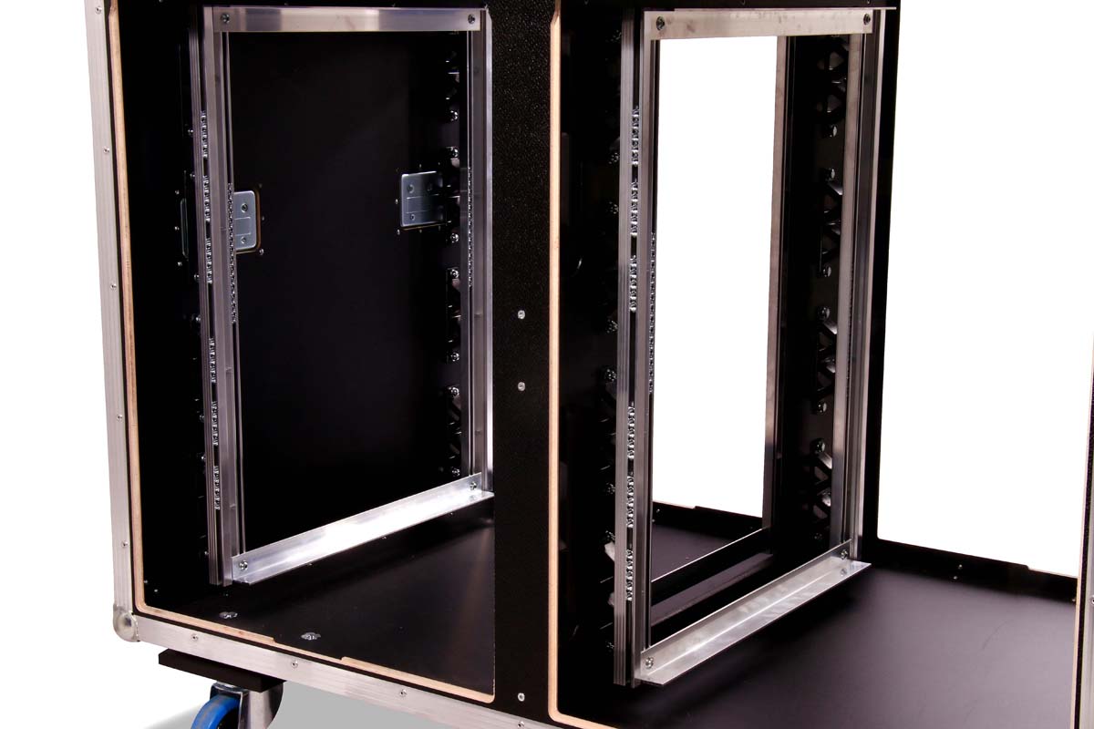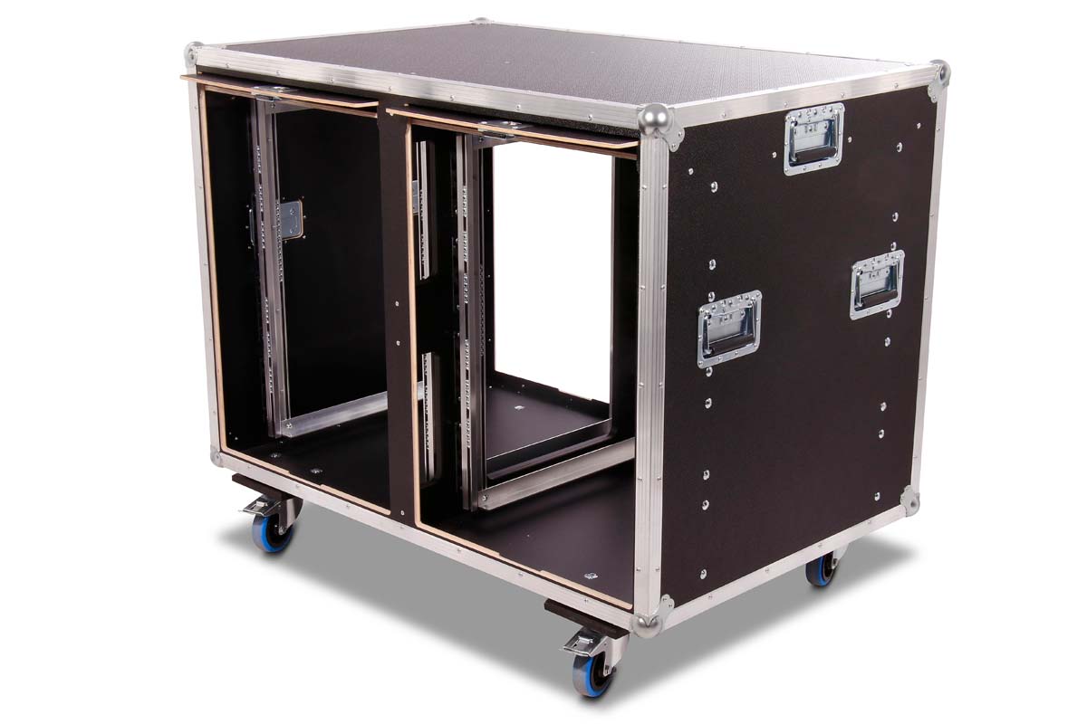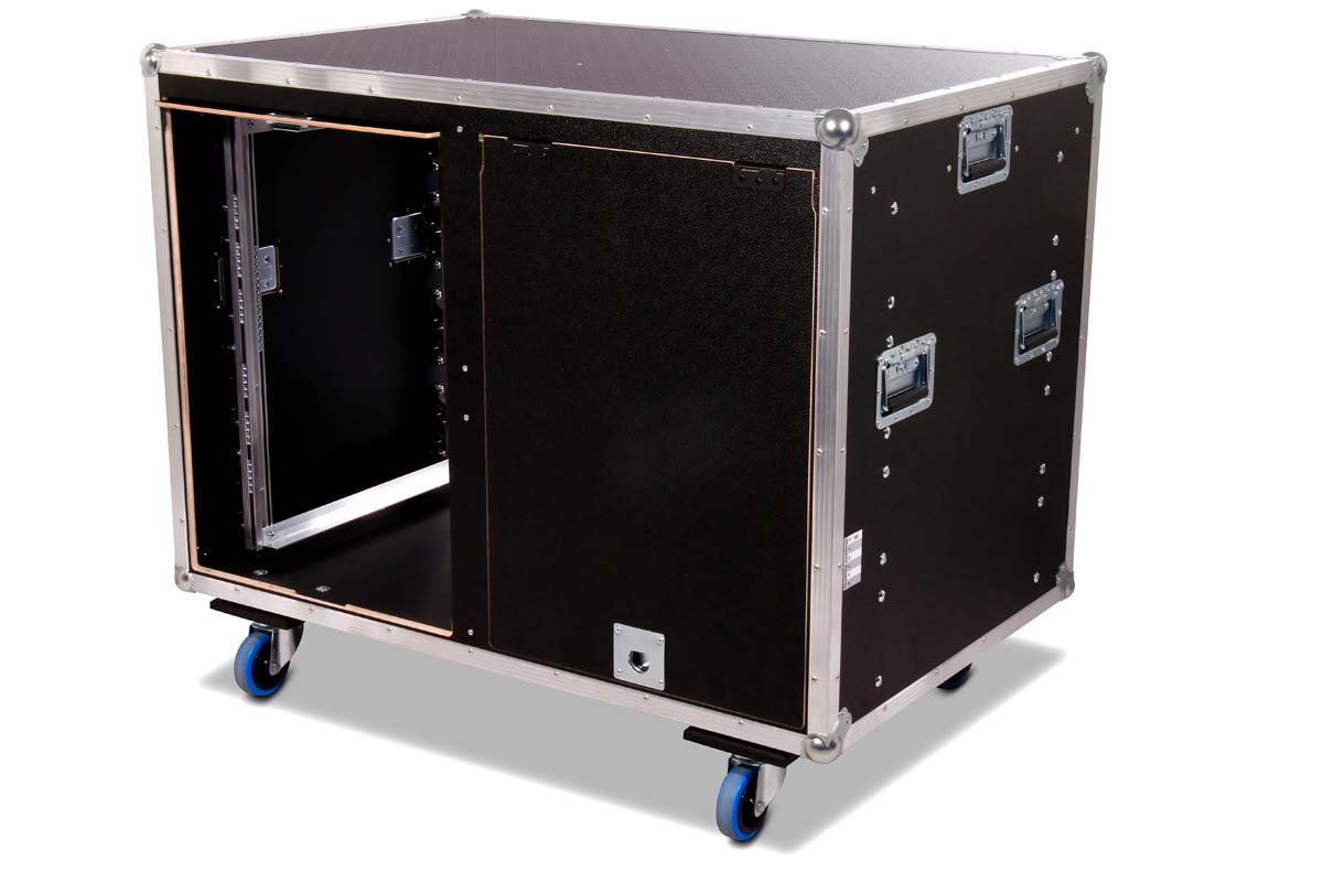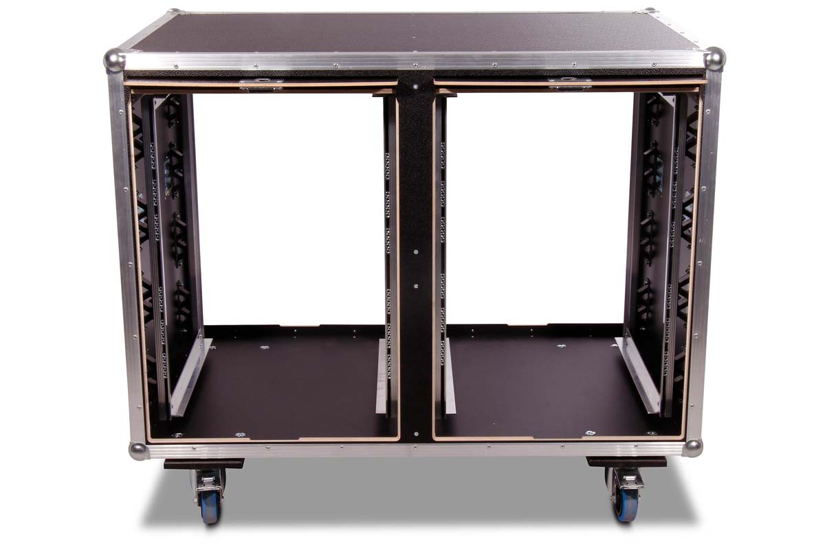 15 HE Rack für 19 Zoll Einbaugeräte mit 4 Türen die als Sliding Version oberhalb der Einbauten