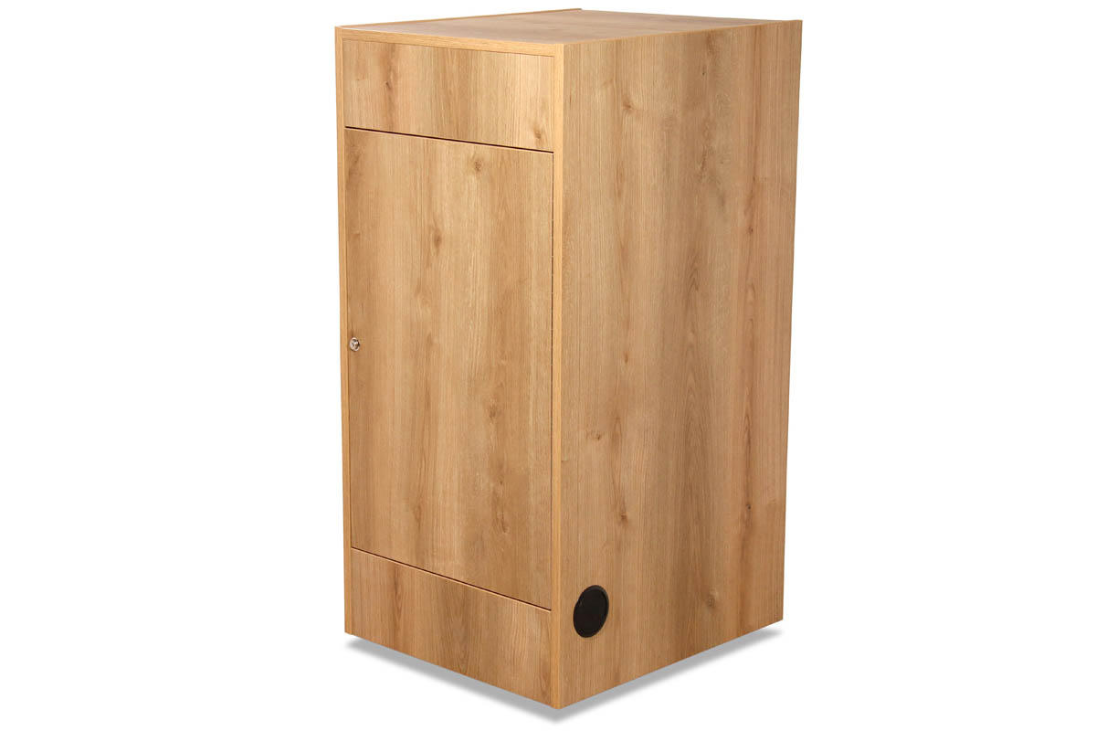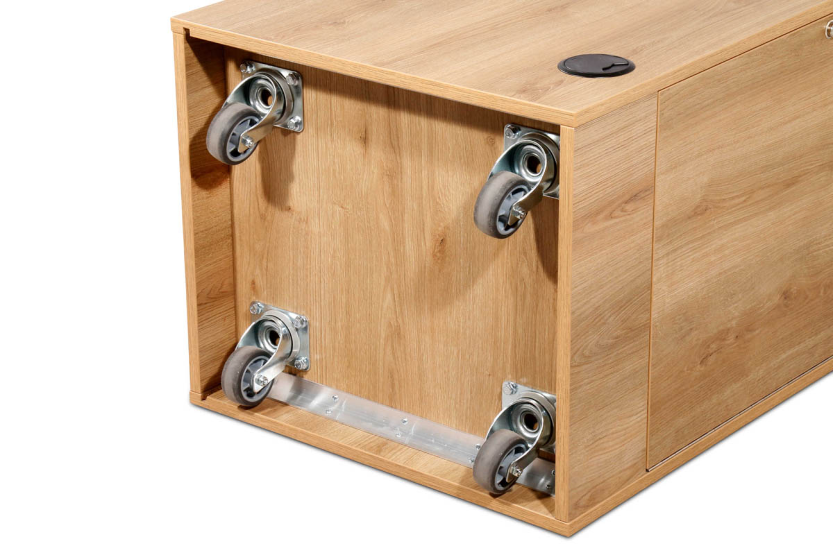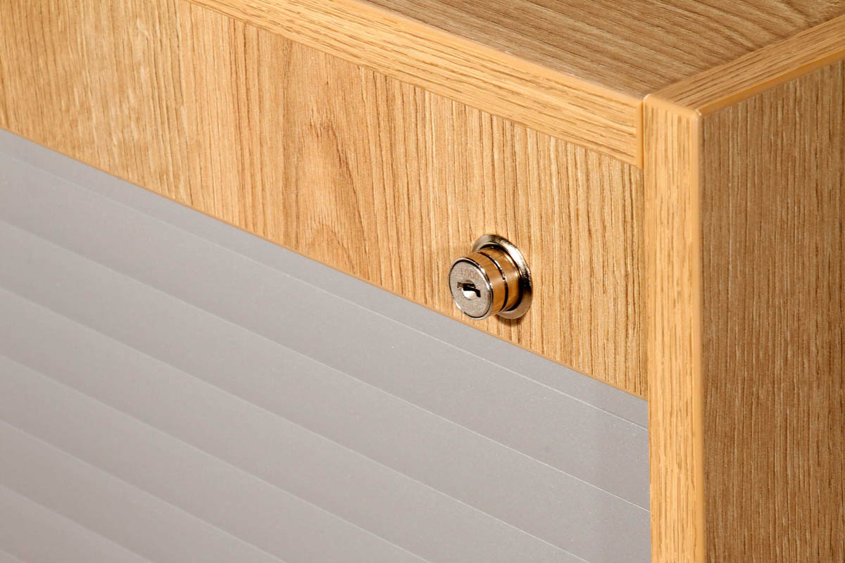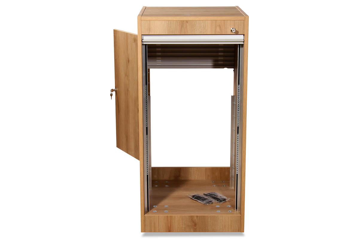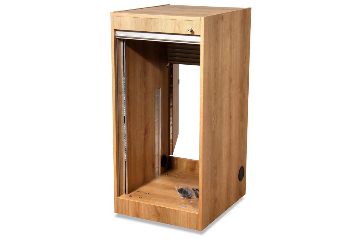 Medien Studio Rack mit abschließbarem Rolladen in Aluminium Optik.
