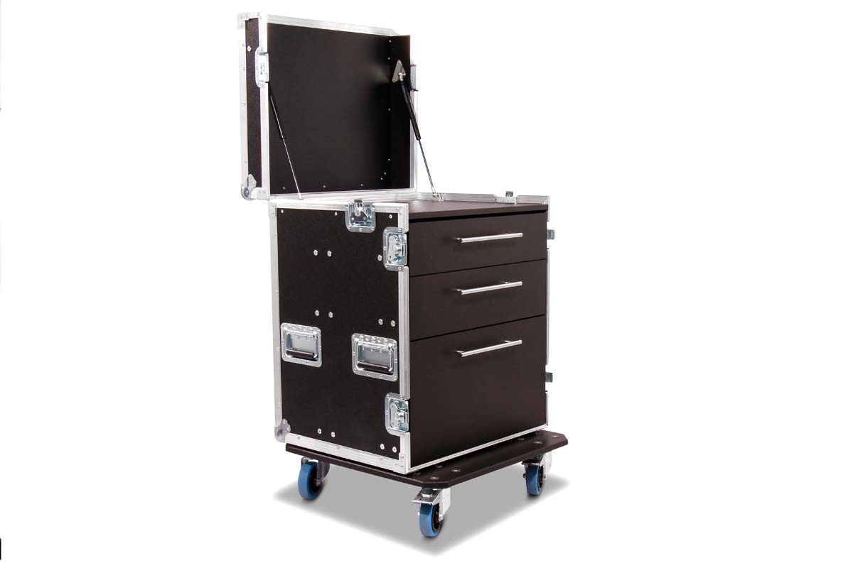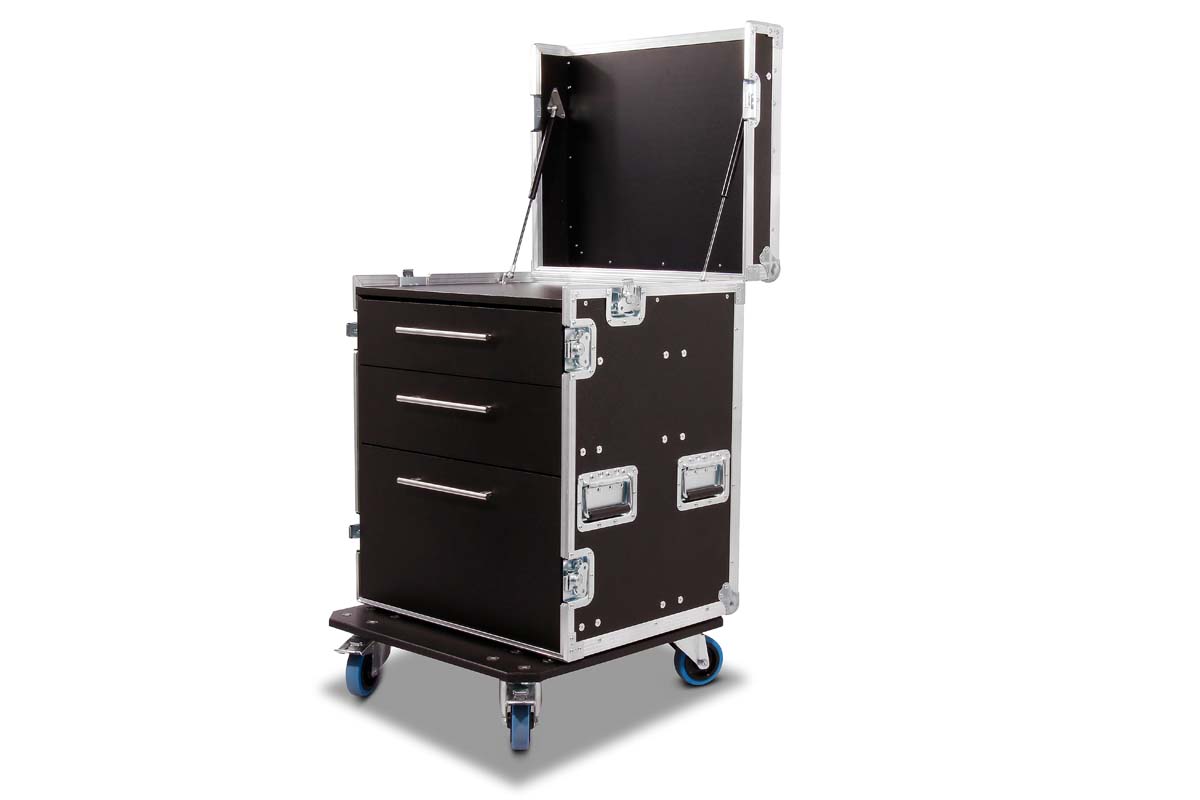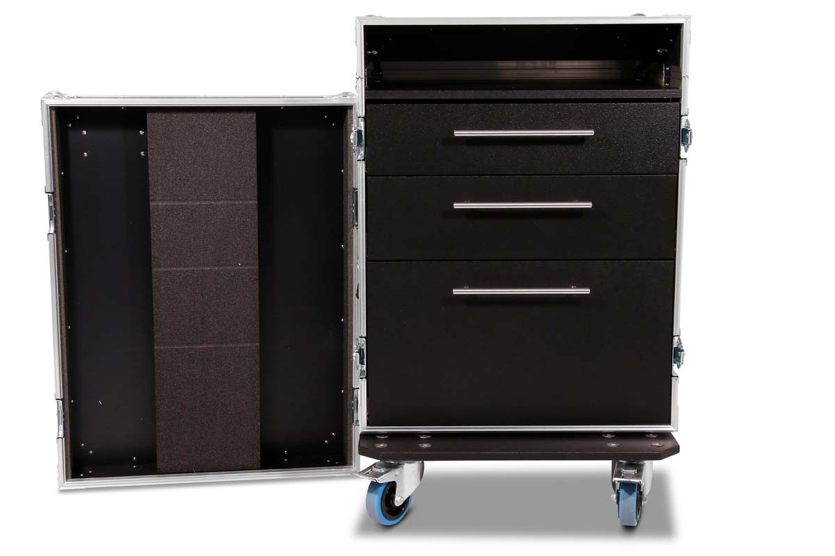 Schubladencase mit 3 Schubladen, Deckel vorne und oben zum öffnen, oben eine Ablage,