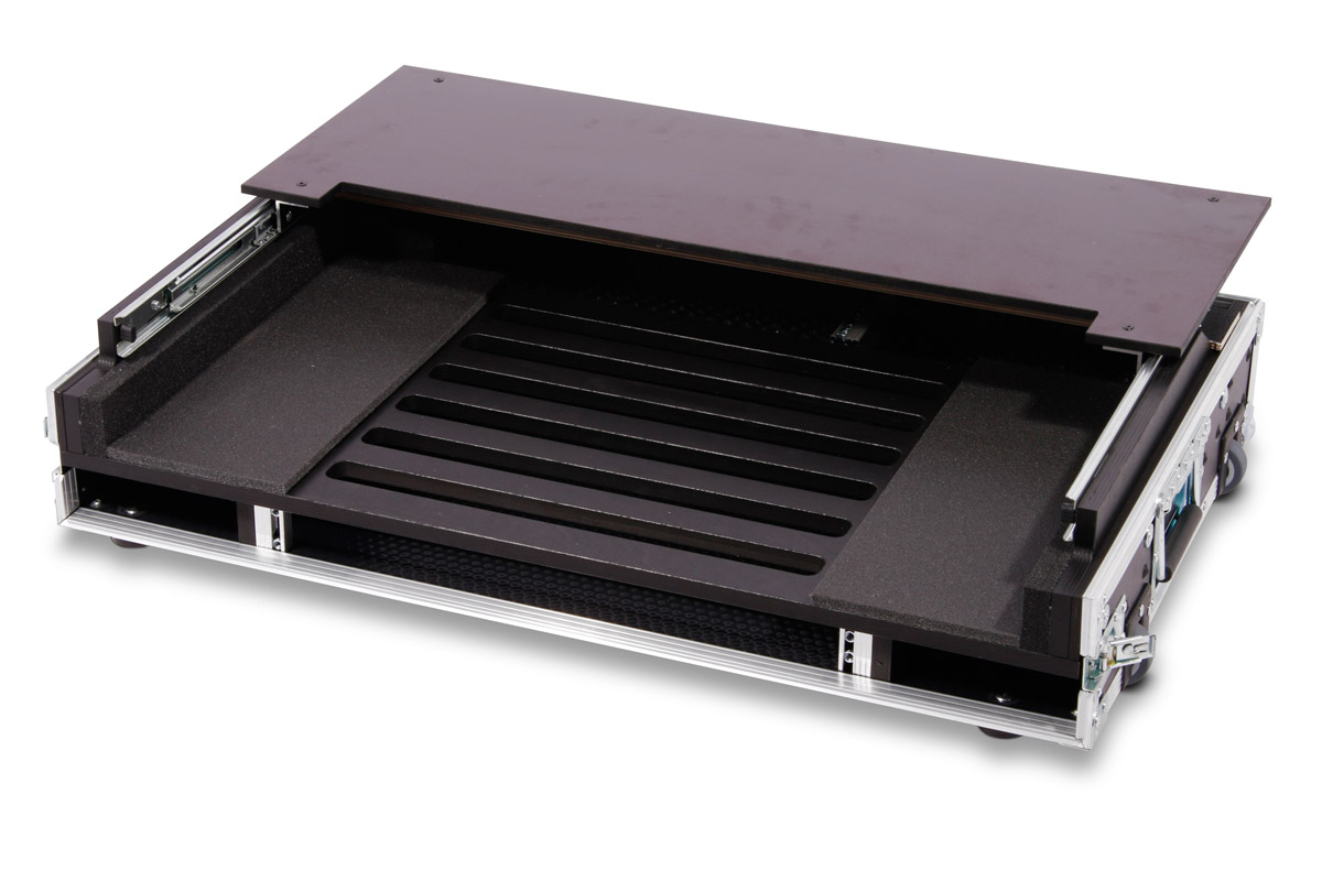 Neben einem Laptop Schlitten befindet sich unter dem Controller eine 1HE Rackeinheit. EIne weitere 2HE Rachschieneneinheit im Rückraum, ermöglicht die Verwendung einer Blende und einer Kabelabdeckung.