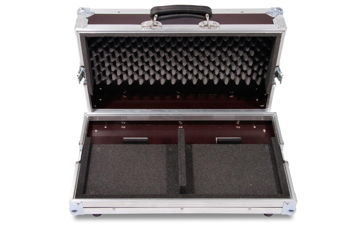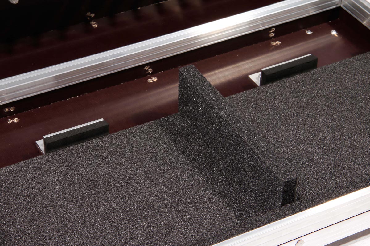 Beide Geräte sitzen, getrennt durch einen Steg, nebeneinander im Unterteil. Zwei Haltewinkel fixieren die Drum Maschine und den Sound Prozessor und halten einen ca. 8 cm Kabelkanal frei.