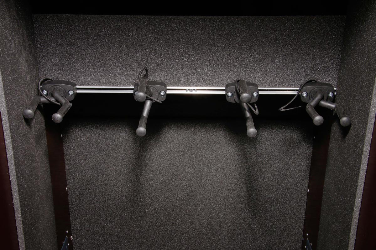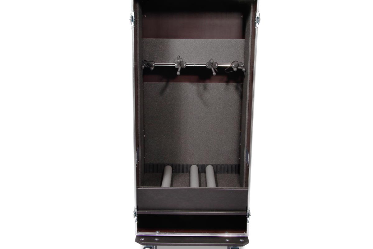 Guitar Tour Schrank für 4 Gitarren. Zwischen den Instrumenten sorgen flexibel einsetzbare