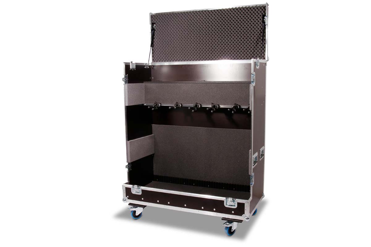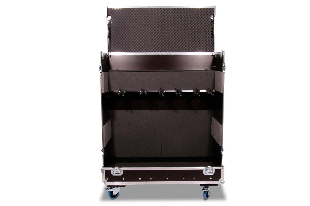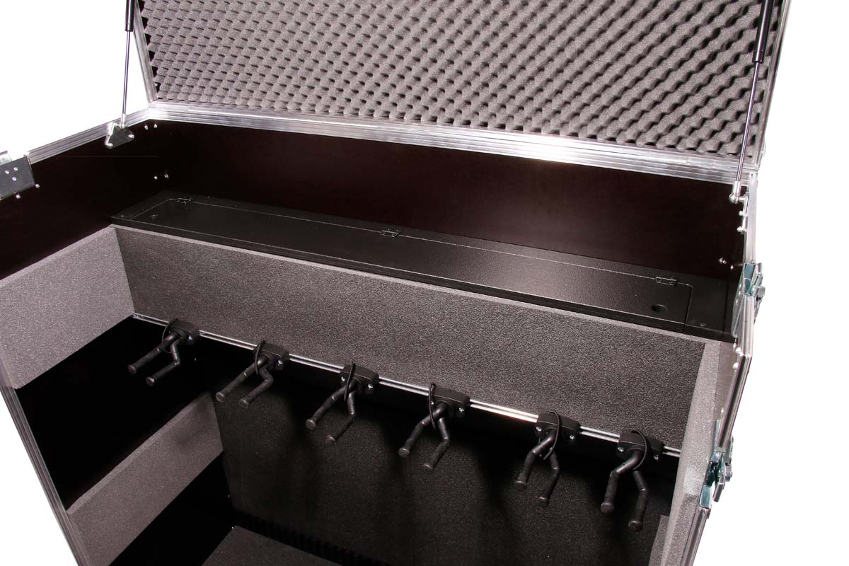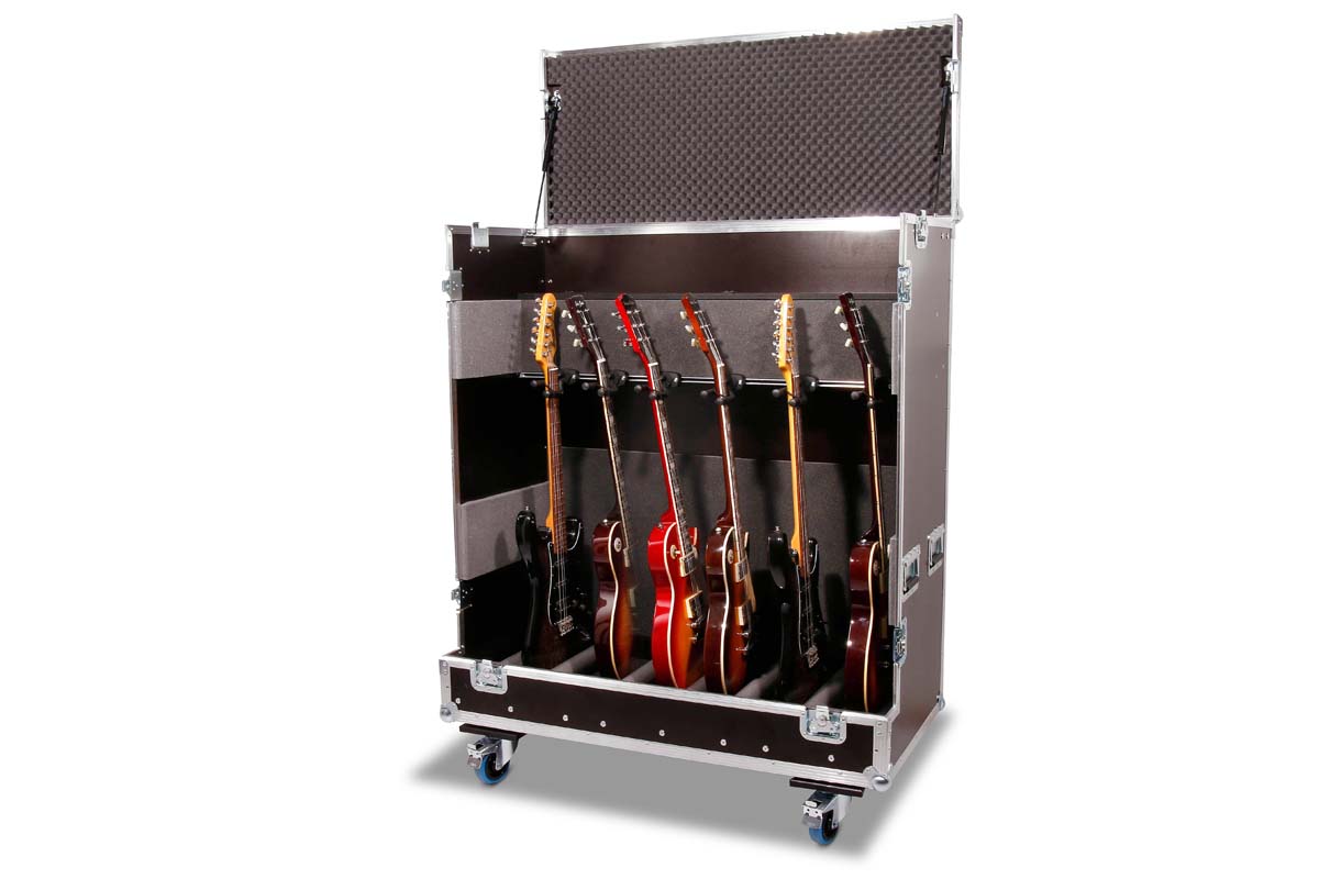 Ein sehr variables Transportcase für sechs E-Gitarren. Das Griffbrett wird mit einem