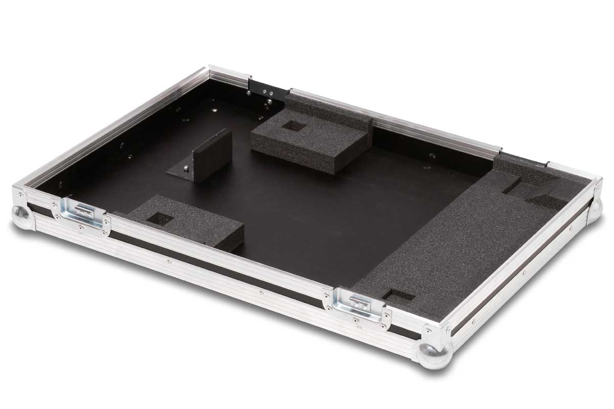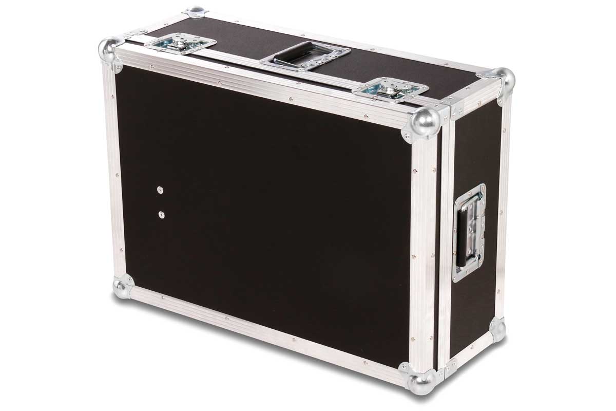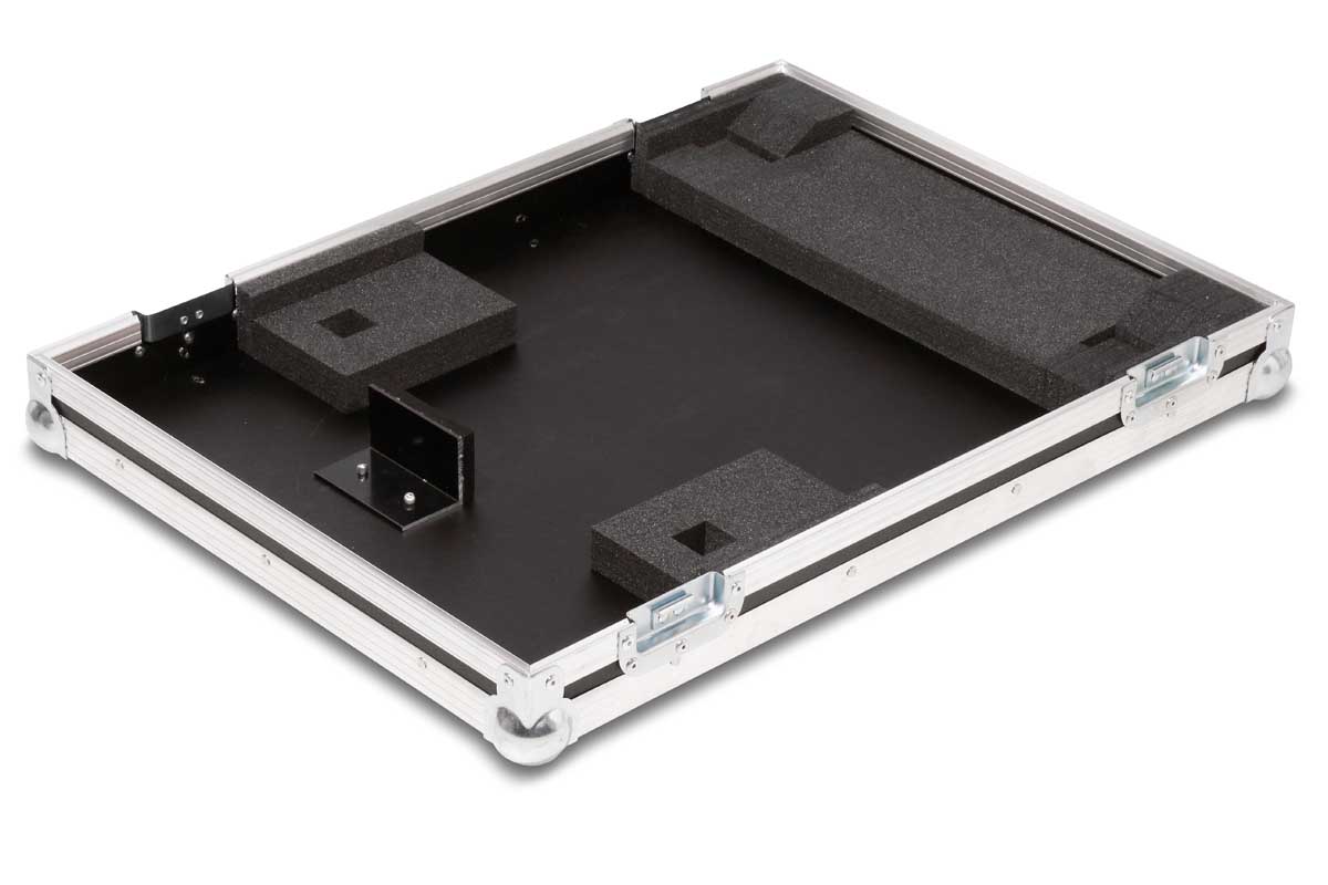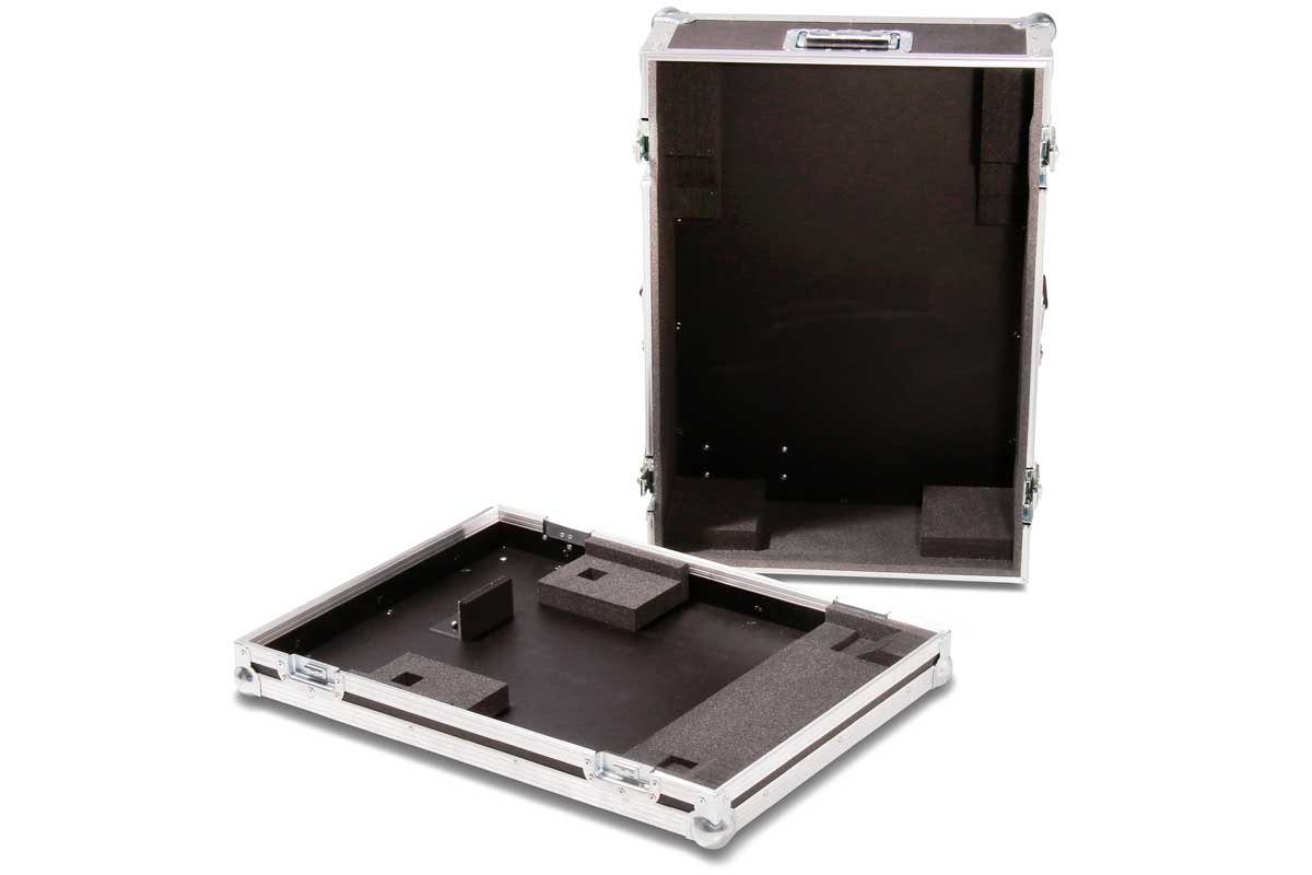 Dieses Transport- und Live-Case kann sowohl stehend oder liegend getragen werden. Die ergonomische Form des digital Mischpults wird durch gefräste Schaumstoffpolster unterlegt.