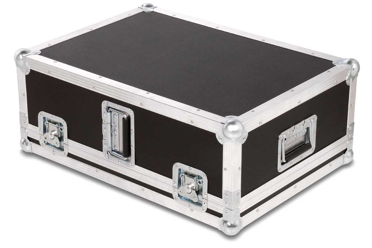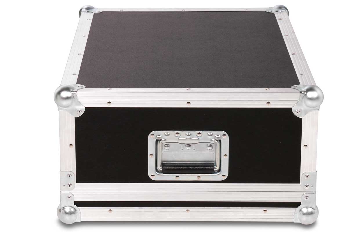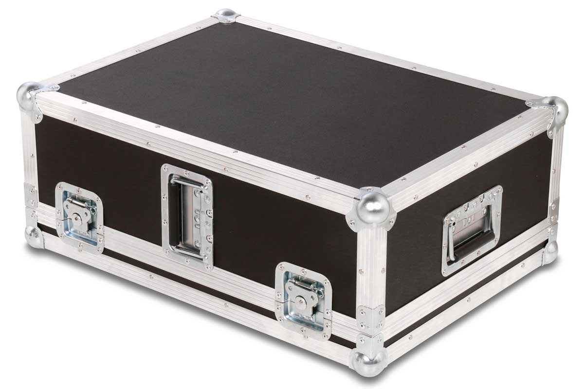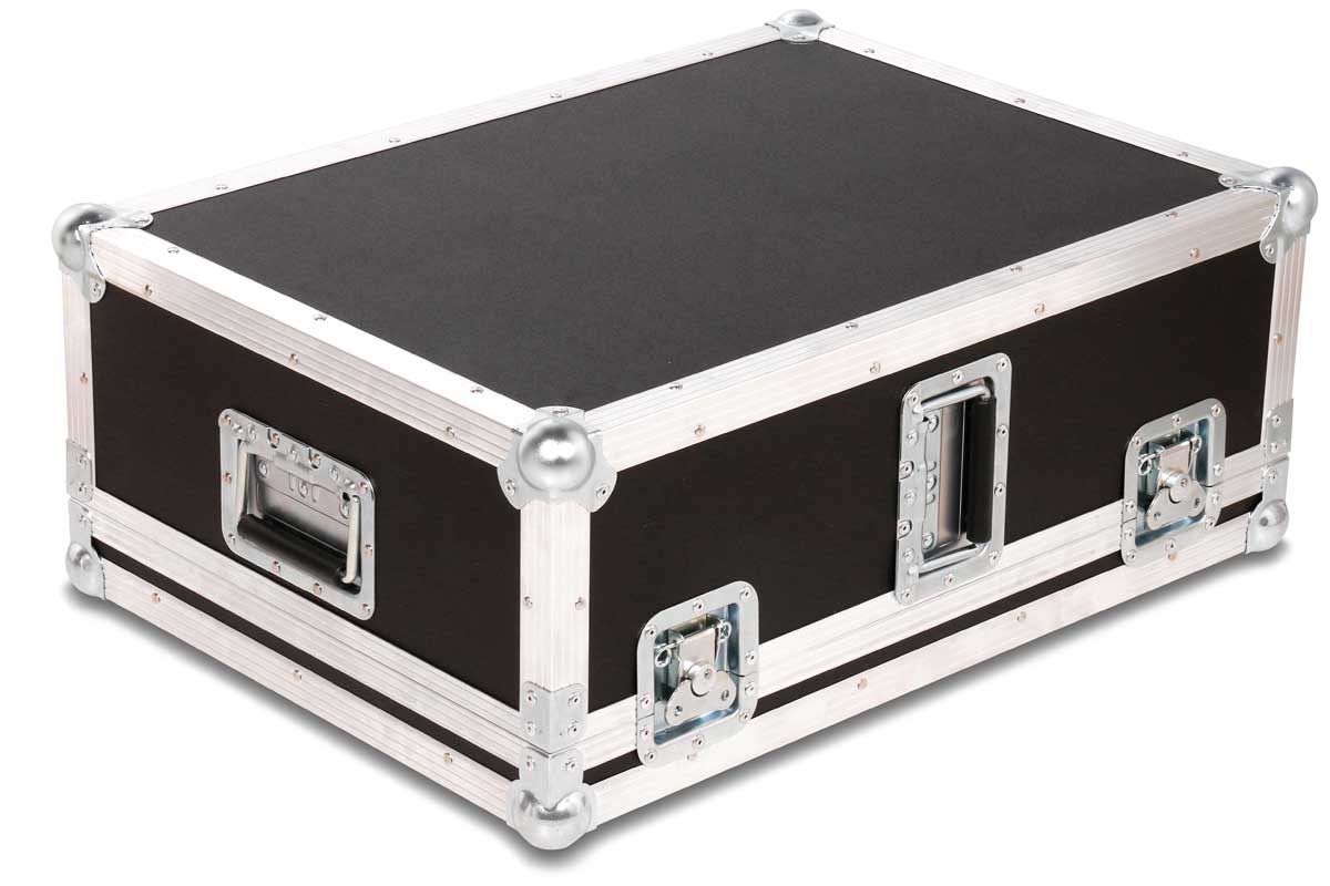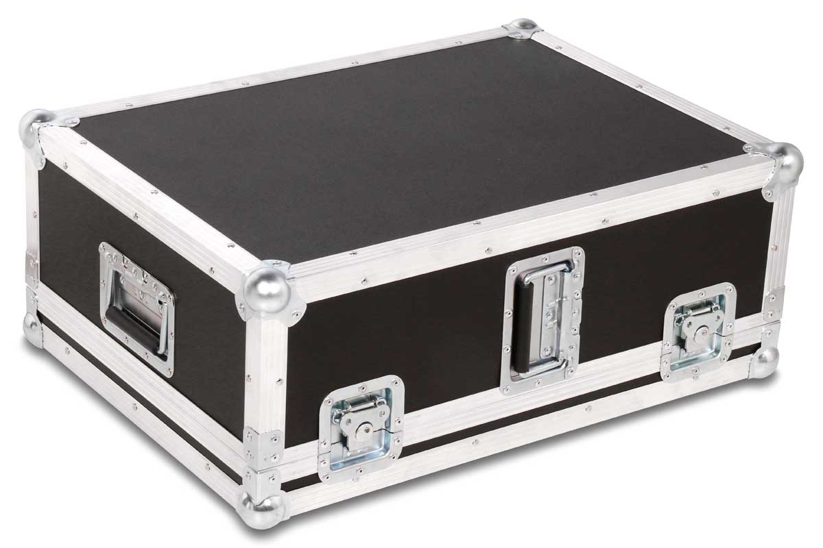 Dieses Transport- und Live-Case kann sowohl stehend oder liegend getragen werden. Die ergonomische Form des digital Mischpults wird durch gefräste Schaumstoffpolster unterlegt.