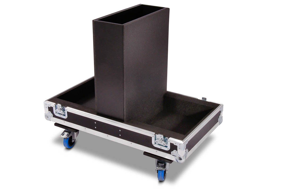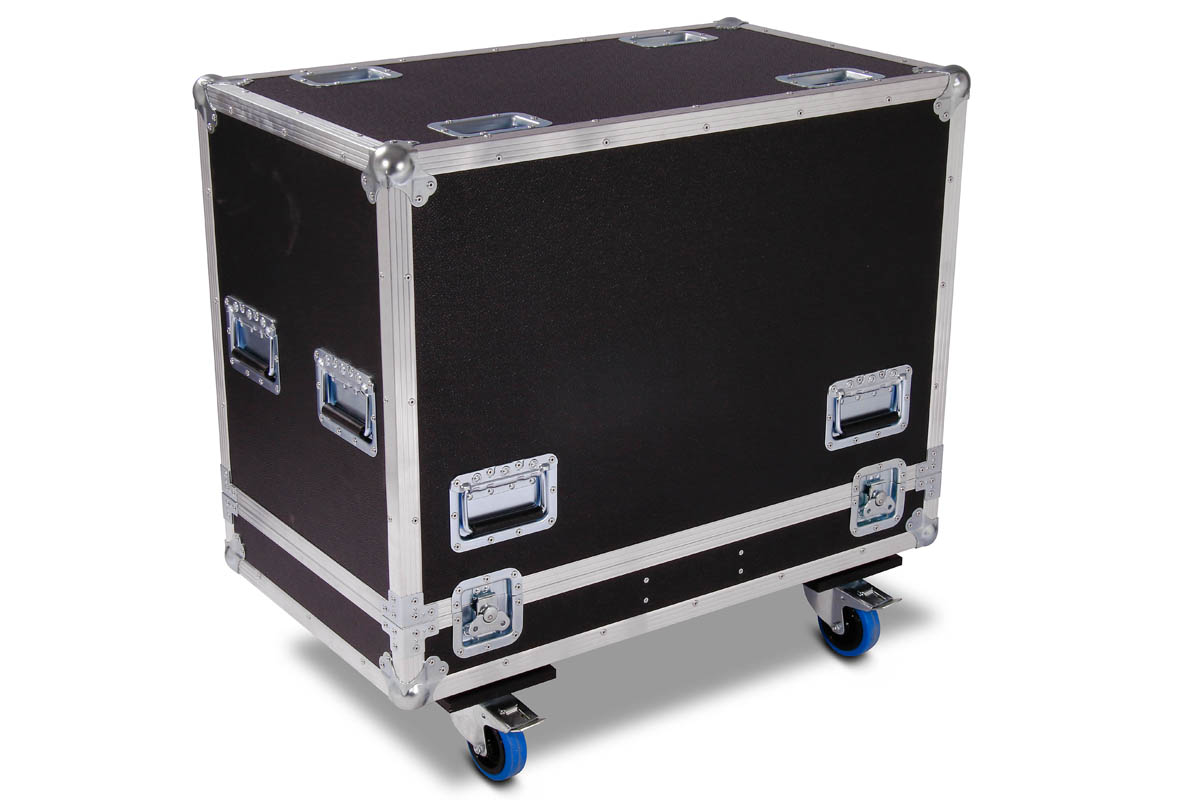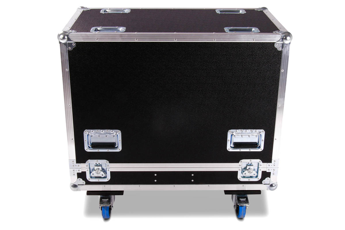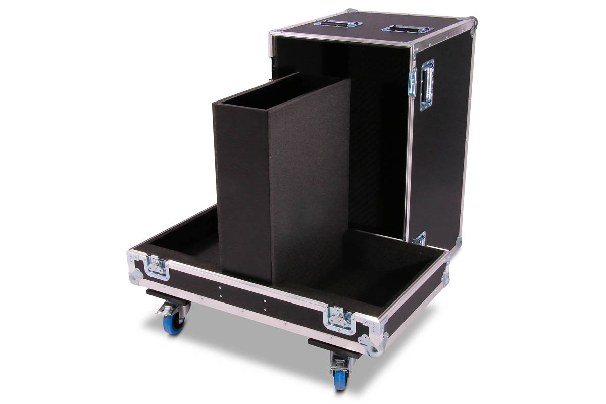 Transport Haube für 2 Stück d&b E9 Lautsprecher mit Lenkrollen und einem 15 cm Kaminfach für Zubehör.