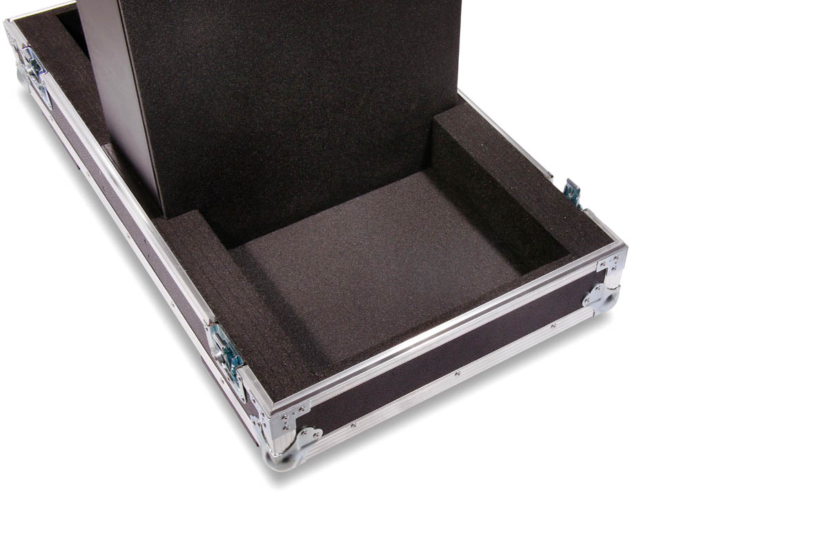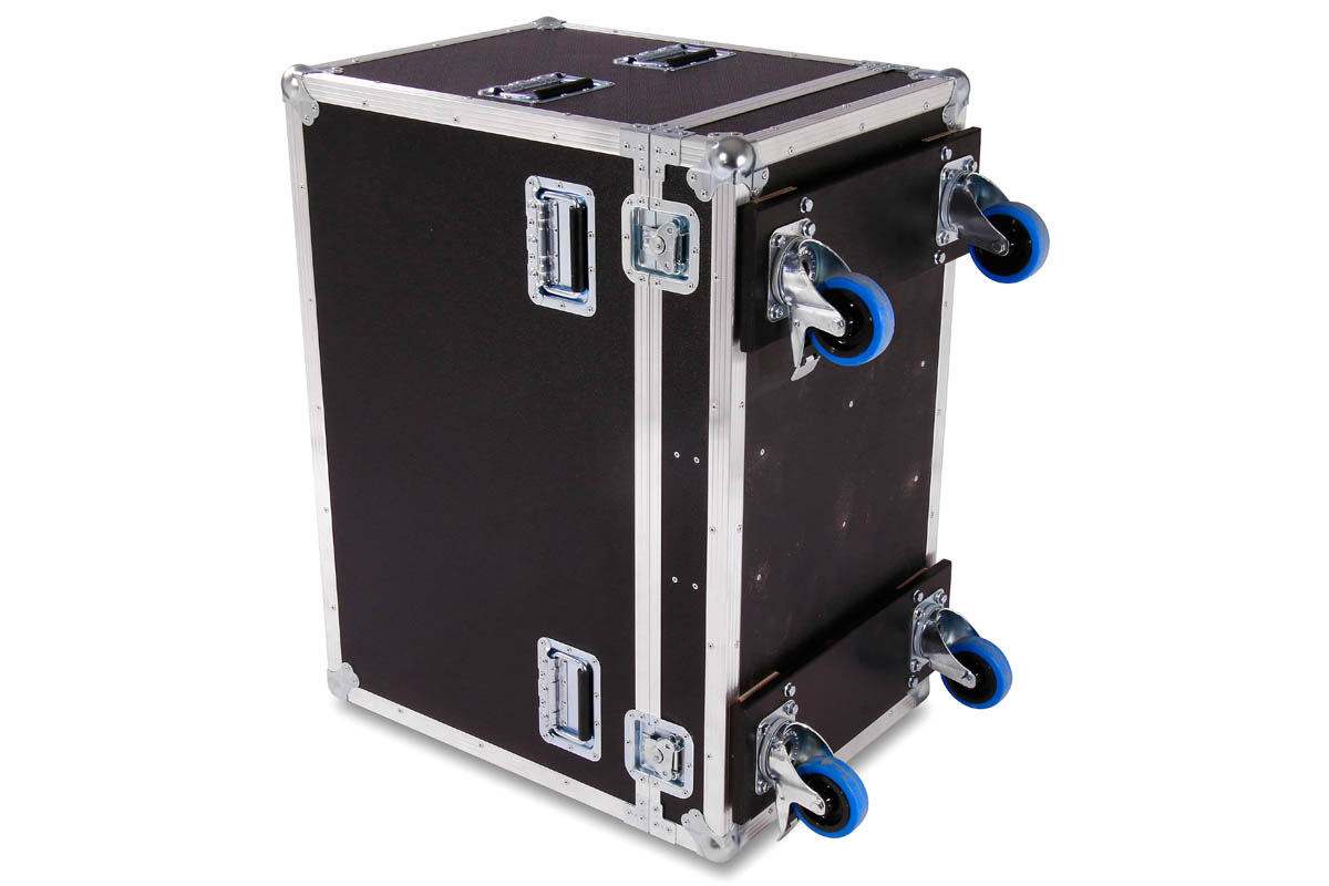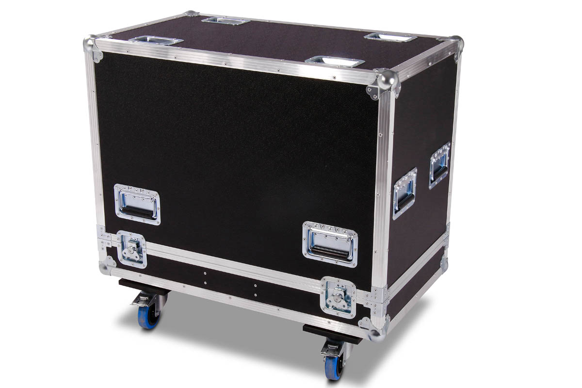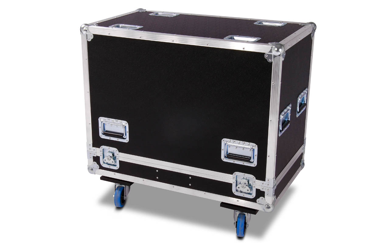 Transport Haube für 2 Stück d&b E9 Lautsprecher mit Lenkrollen und einem 15 cm Kaminfach für Zubehör.