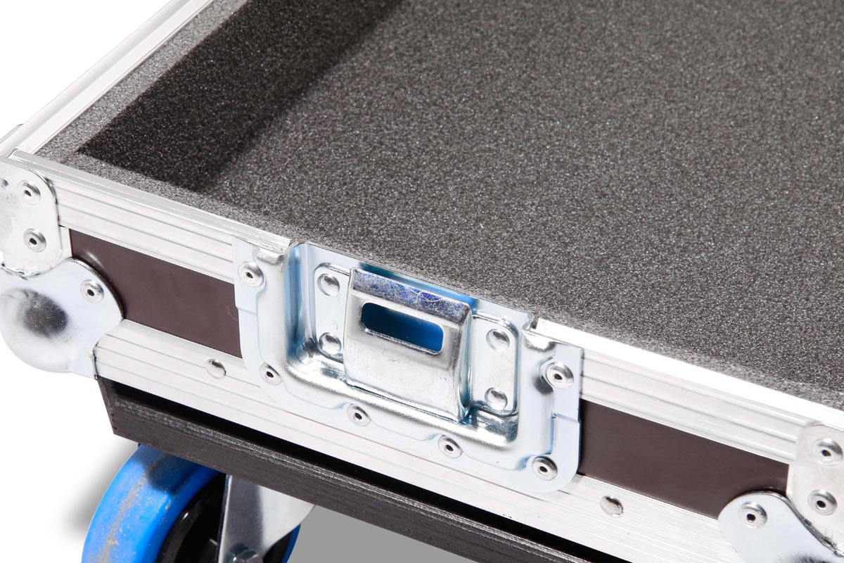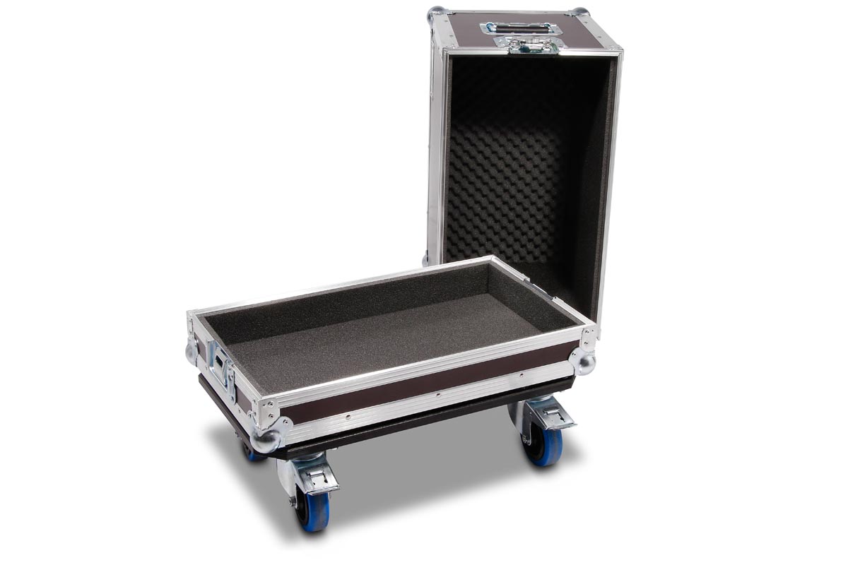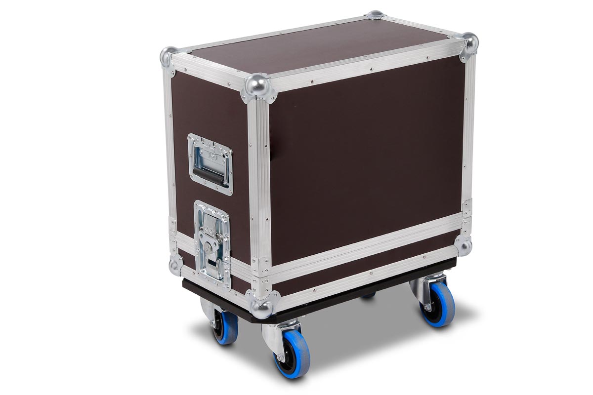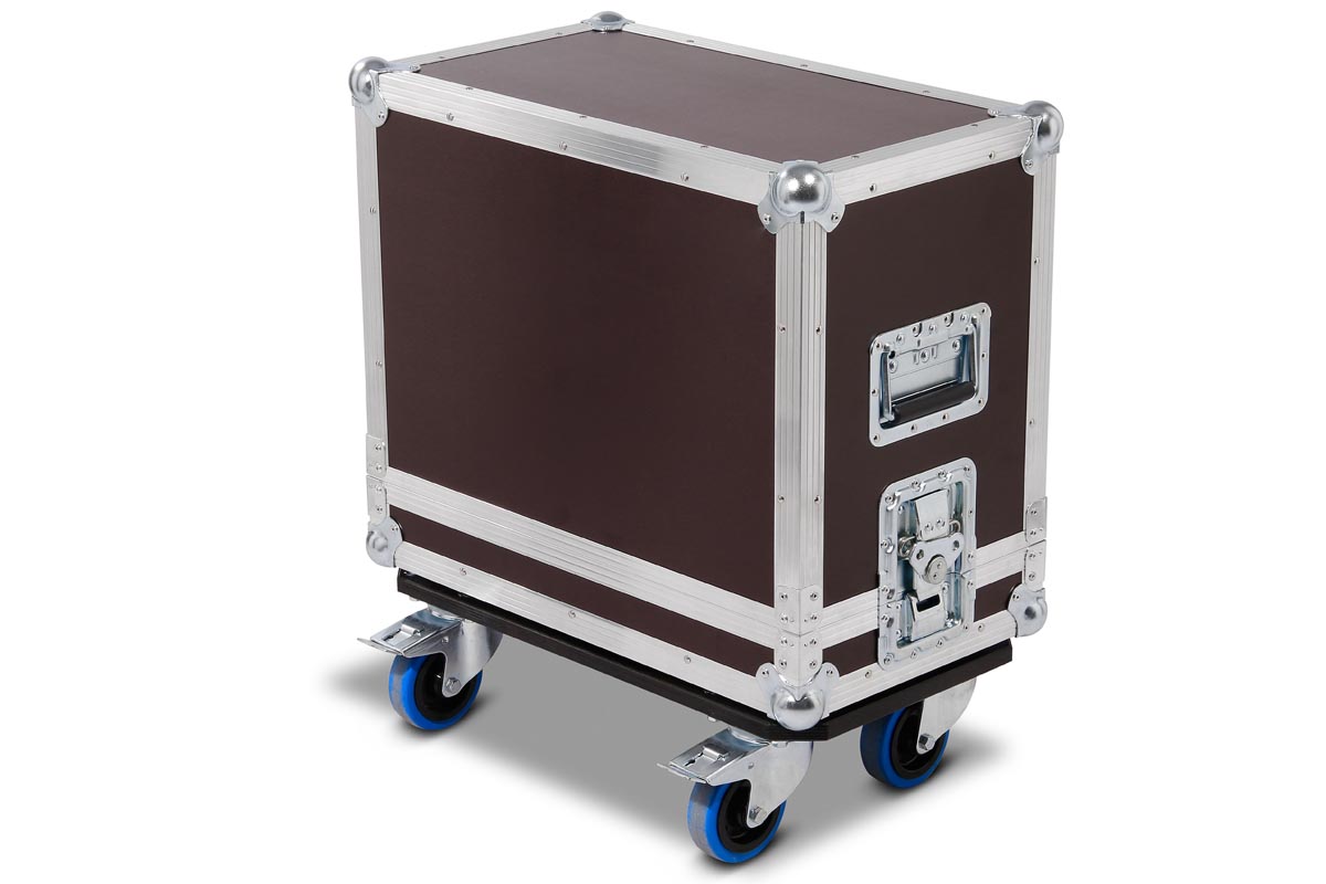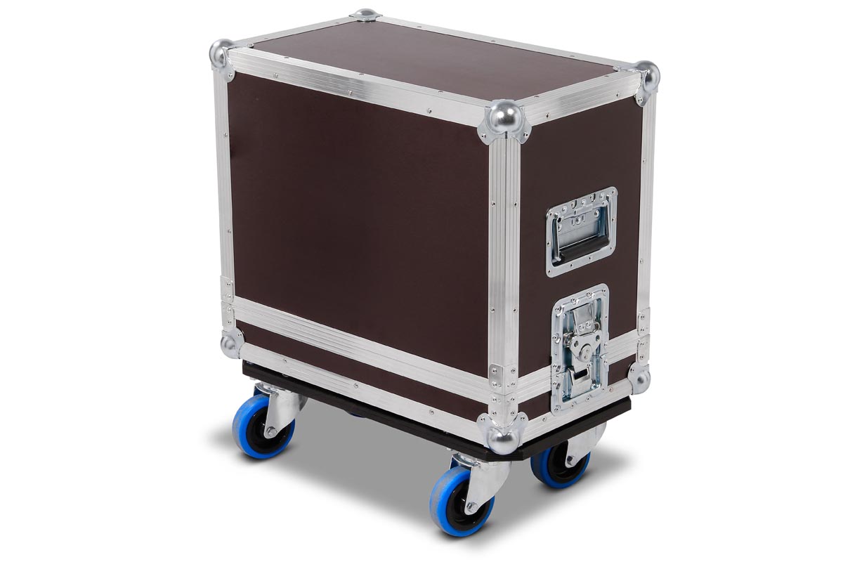 Hauben-Case für Marshall Code 50 Combo mit Rollbrett gebremst. Mit gesicherten Bremsen kann der Marshall im Betrieb auch im Unterteil bleiben.