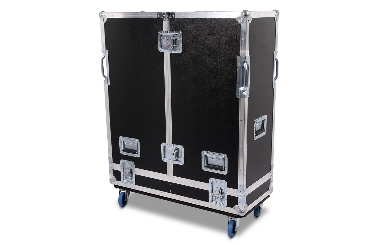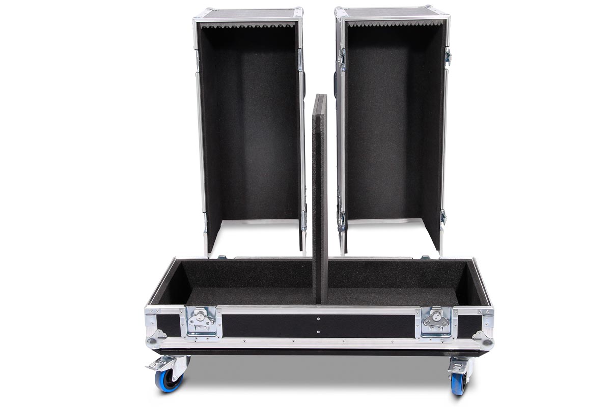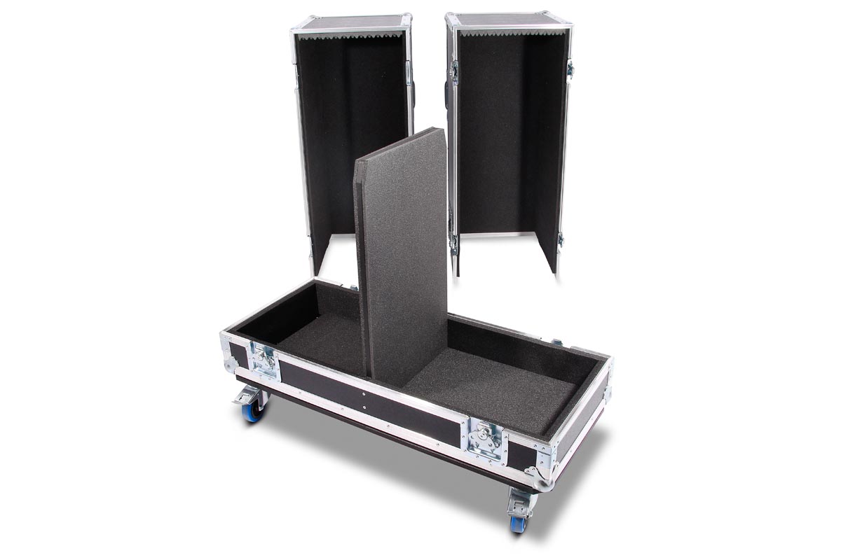 Zwei Line-Array Lautsprecher passen in dieses geteilte Haubencase. Ein gepolstertes Brett trennt die Boxen voneinander.