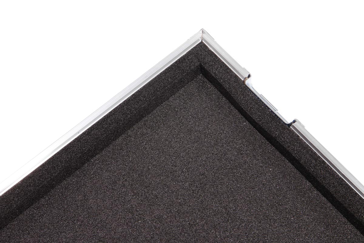 Transporthaube mit 2 cm Polsterung und hochwertigen Bauteilen, wie Aluminiumkanten, Stahlkugelecken, Butterfly Dreh Verschlüsse und Klappgriff aus Stahl.