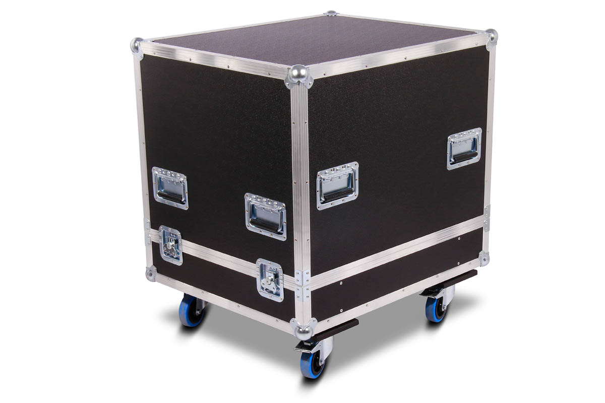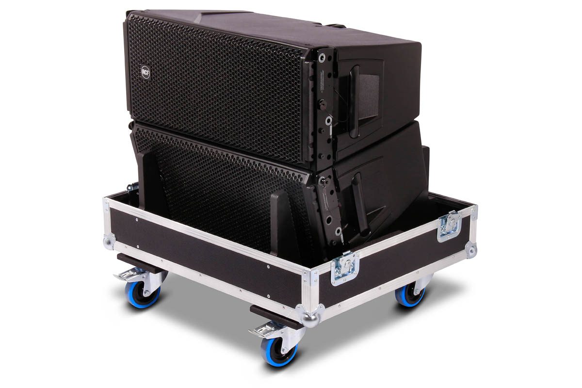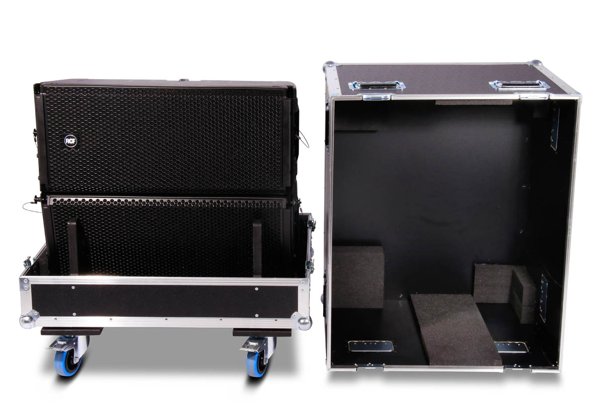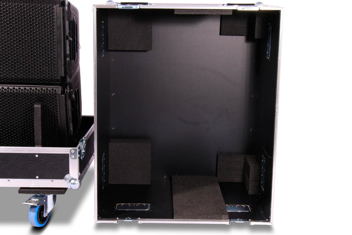 Haubencase schwarz auf Rollen (2 gebremst) mit Schaumstoffpolsterung und Holzjochen für 2 Stück RCF HDL-30A Line Array.