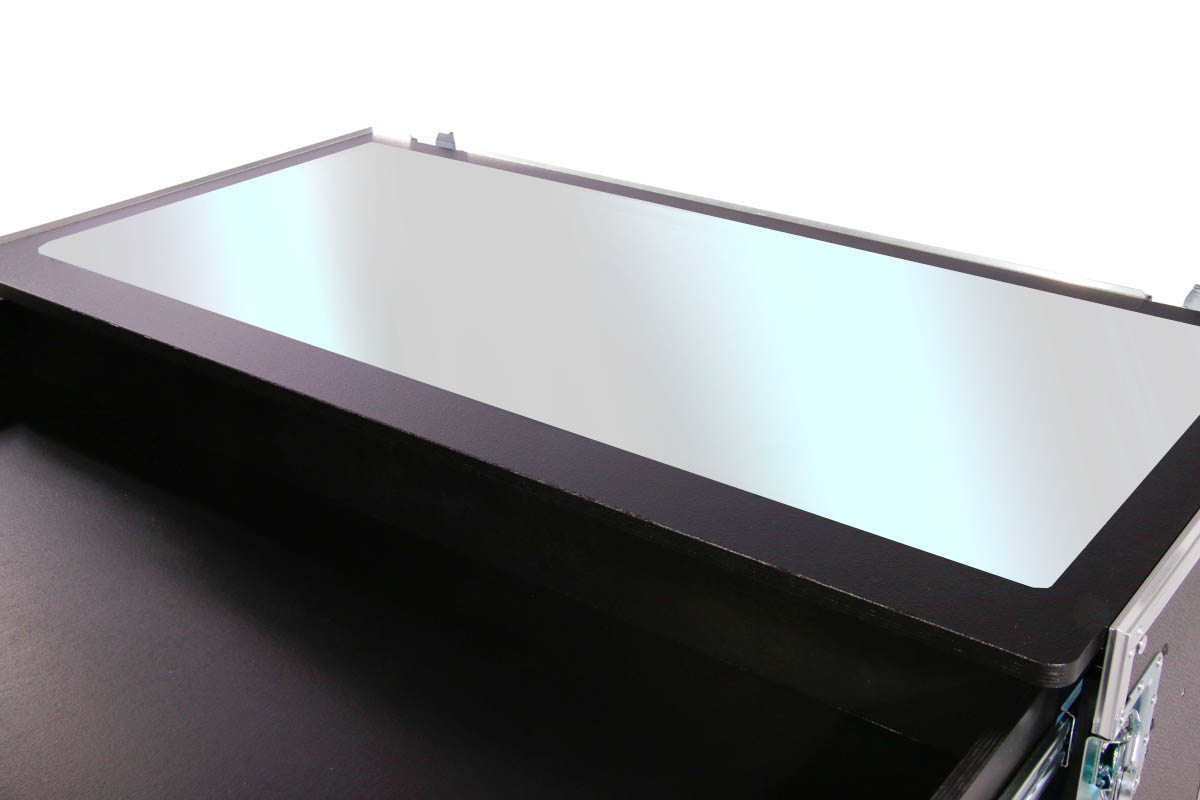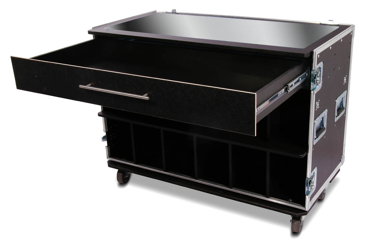 Nach Maß gefertigtes Heavy Case für Merchendise Produkte mit einer Schublade und einem Plexiglas Einsatz als Verkaufstheke.