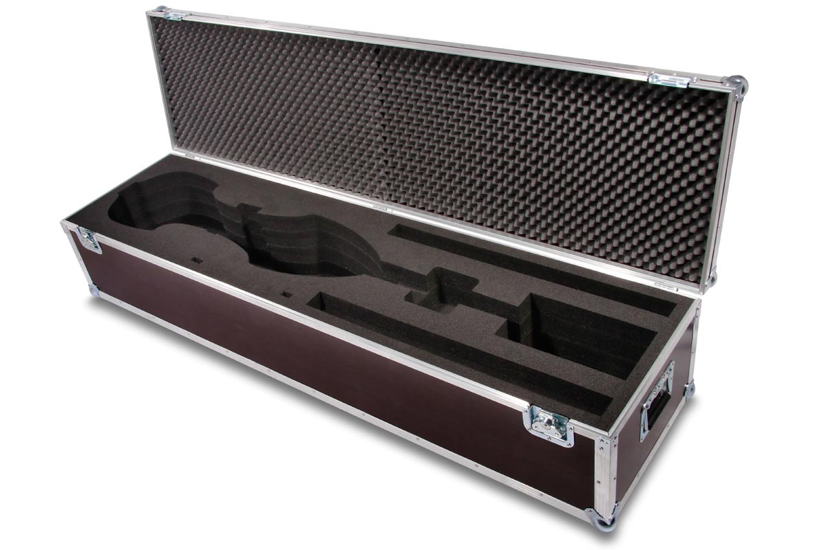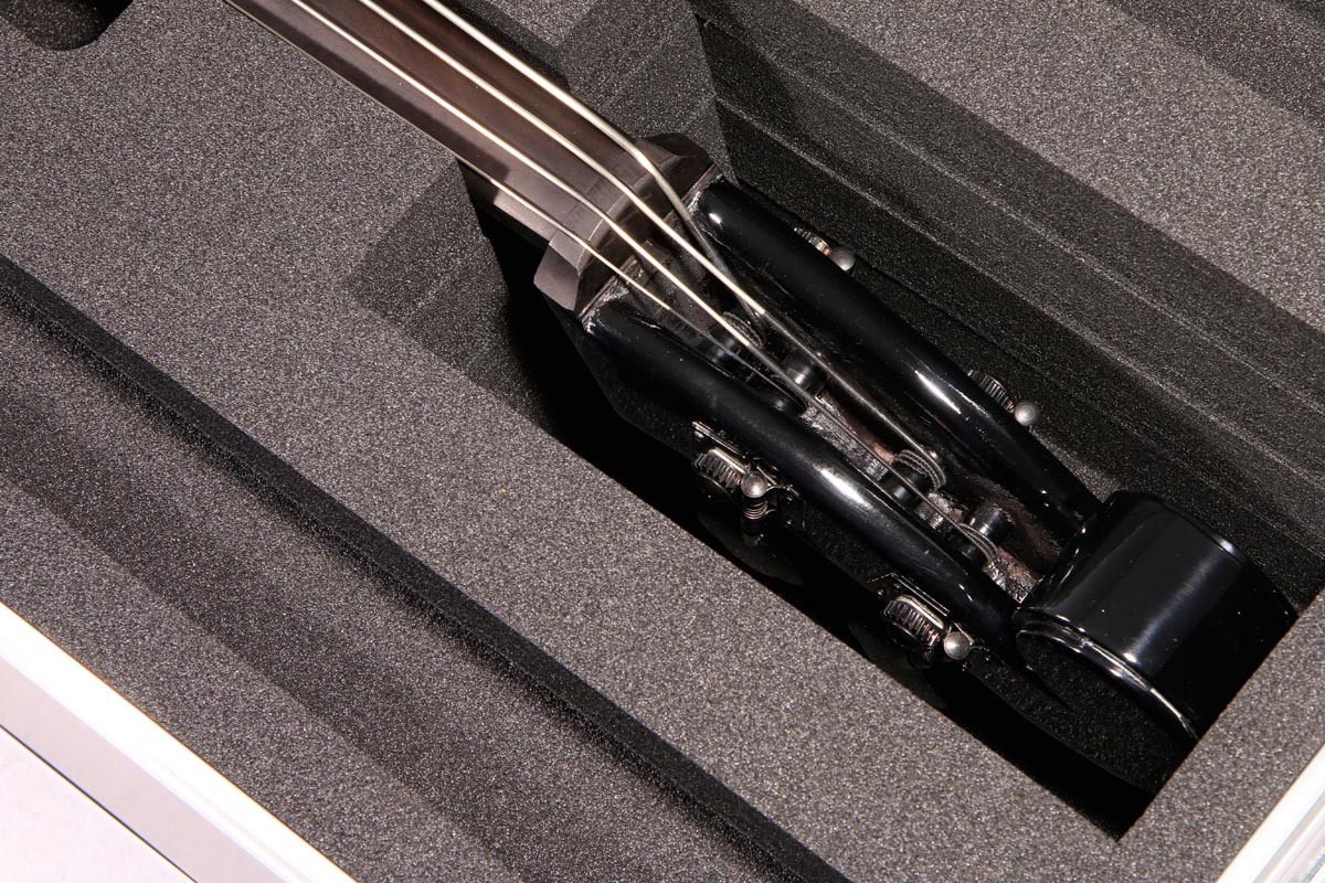 Ein Koffer mit individuell angepasstem Inlay. Die sehr spezielle Form desEUB 500 SB Elektric Upright Bass,