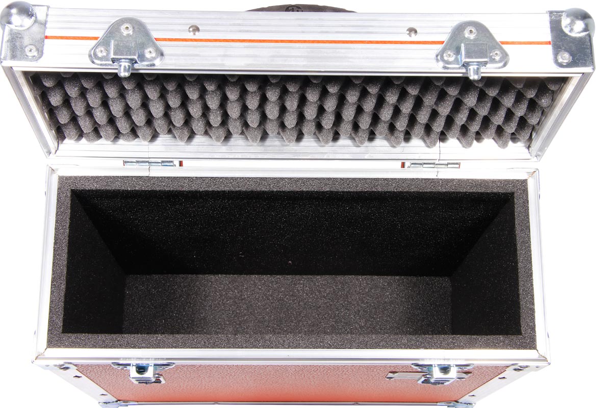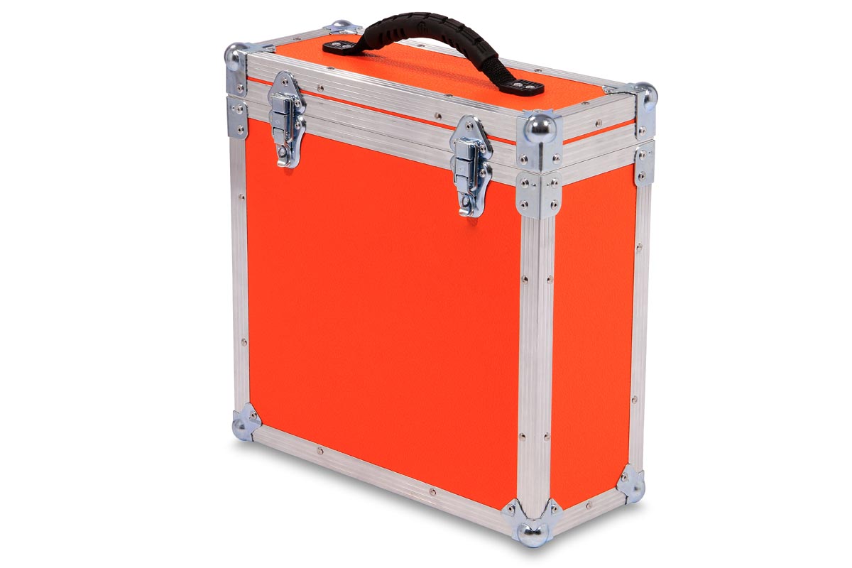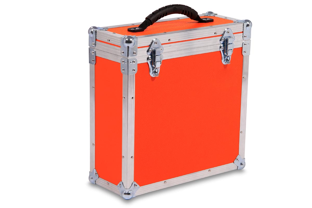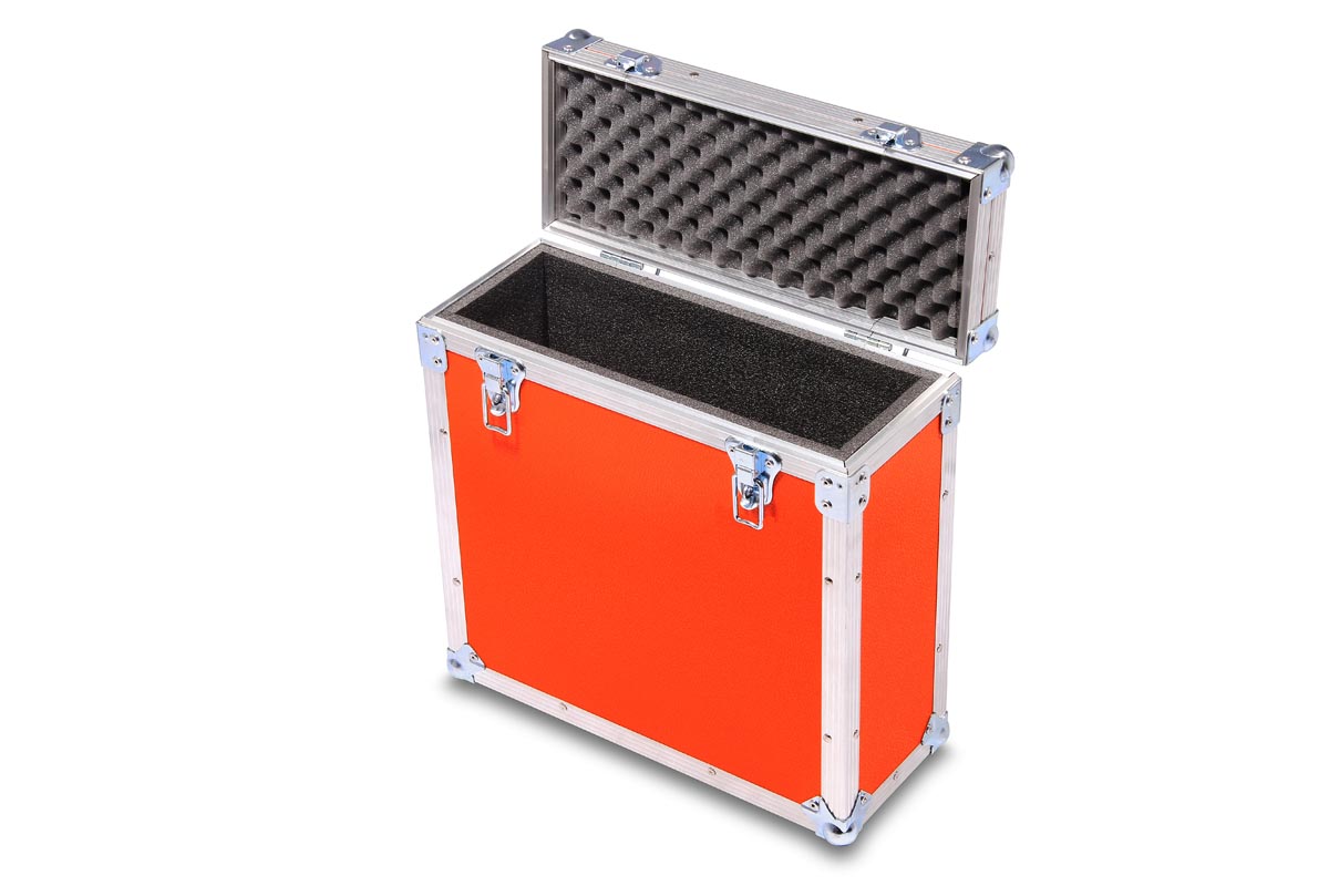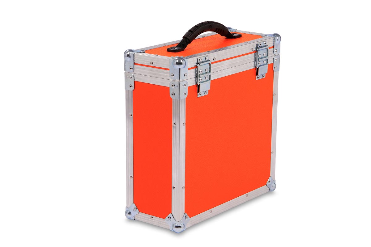 Dieser Koffer ist ein Highlight und Eyecatcher alleine durch seine markante Orange Farbe. Doch die wichtigen Merkmale sind sein nahezu unverwüstliches Äußeres. Mehrschichtholz und Aluminium Kanten sowie Stahlkugelecken verleihen ihm neben der Sicherheit auch noch des typische Flightcase Design.
