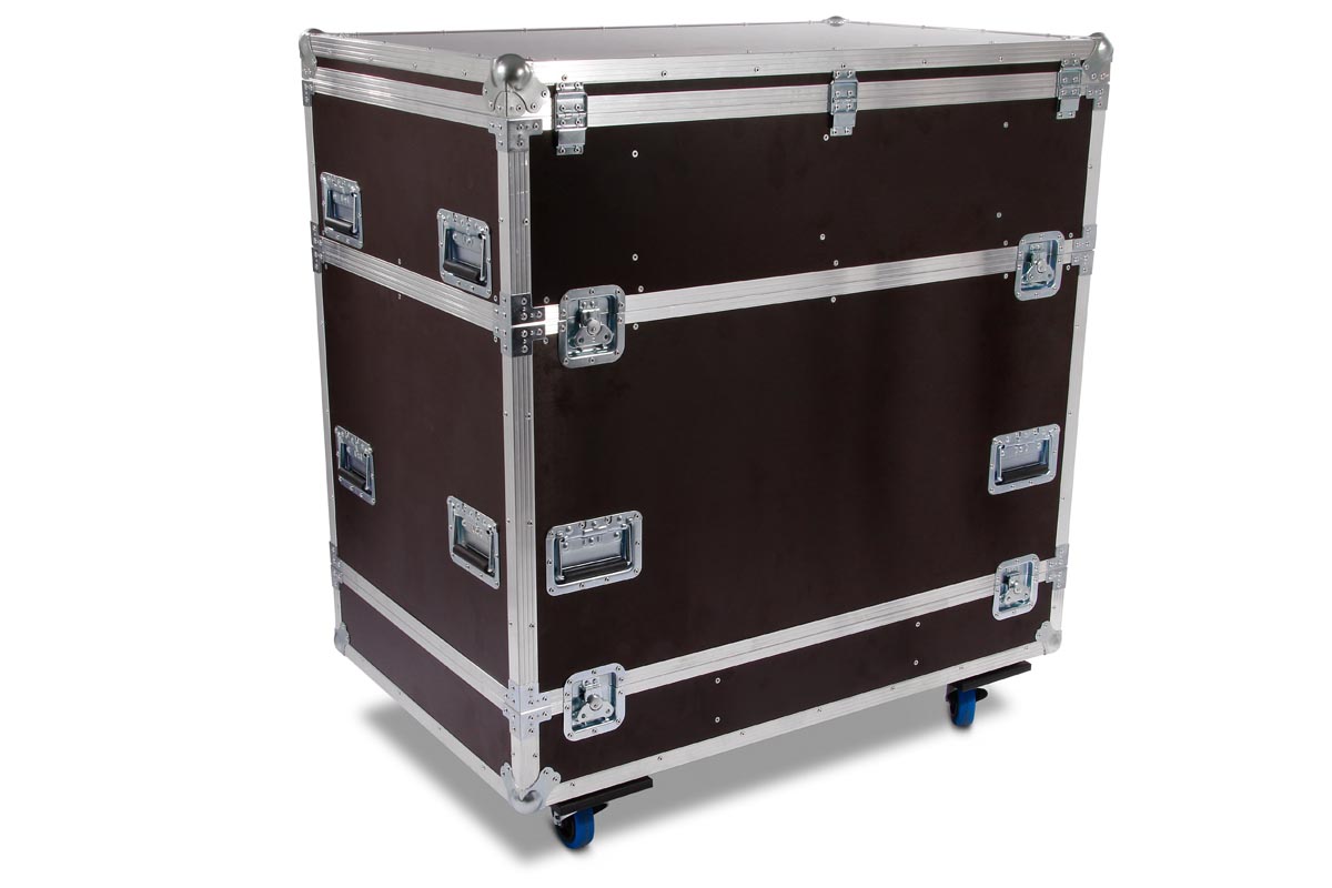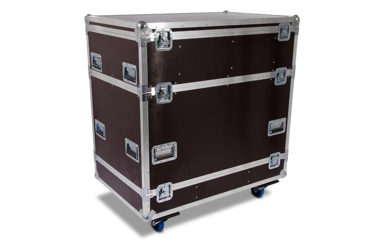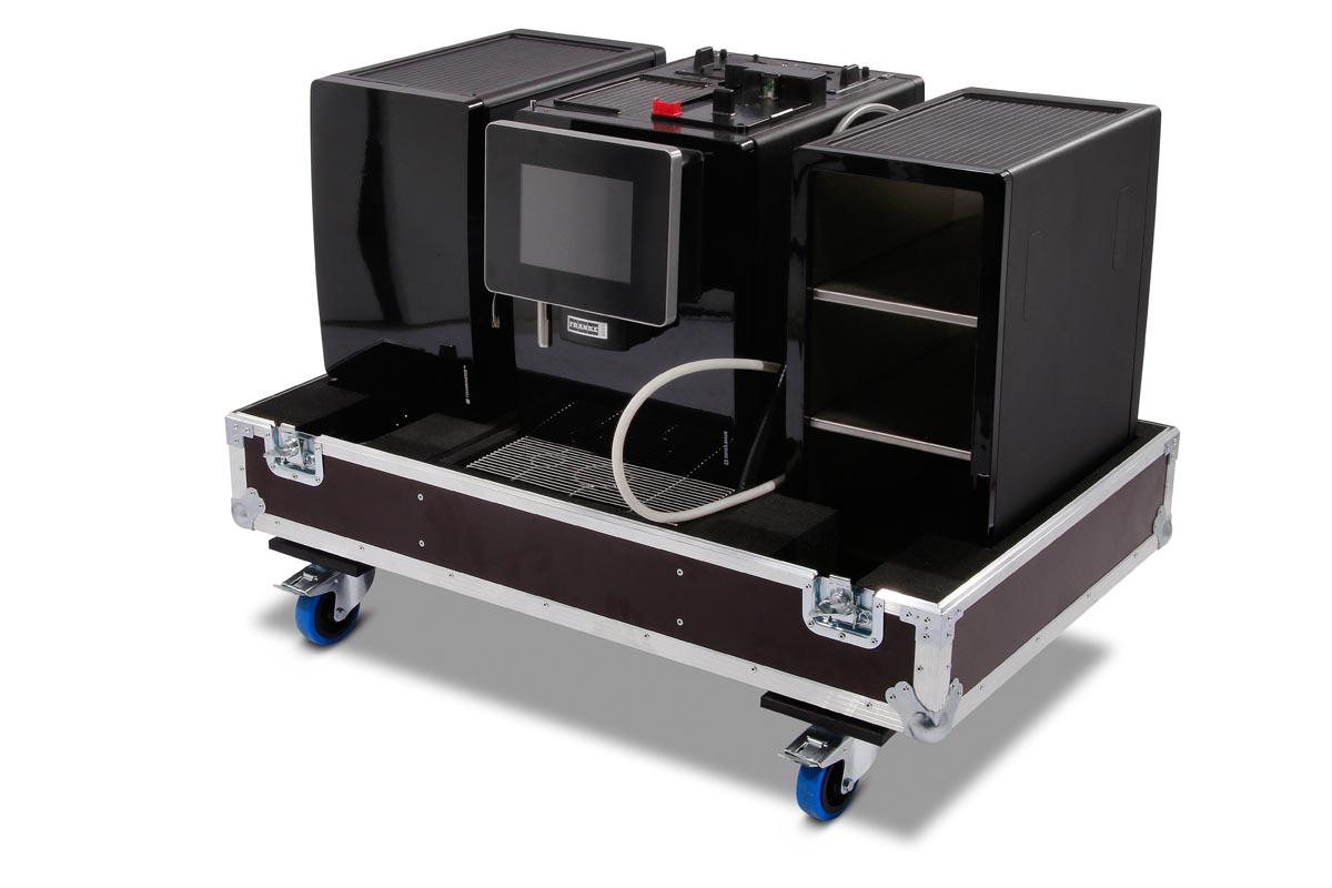 Hauben Transportcase für eine Franke Kaffemaschine. Die Haube ist zweigeteilt und hat im obersten, abnehmbarem Element, eine Truhe mit 5 Fächern für Zubehör integriert.