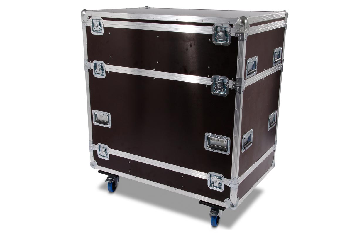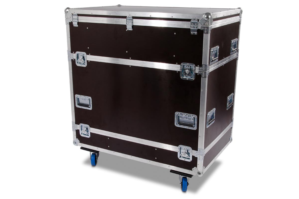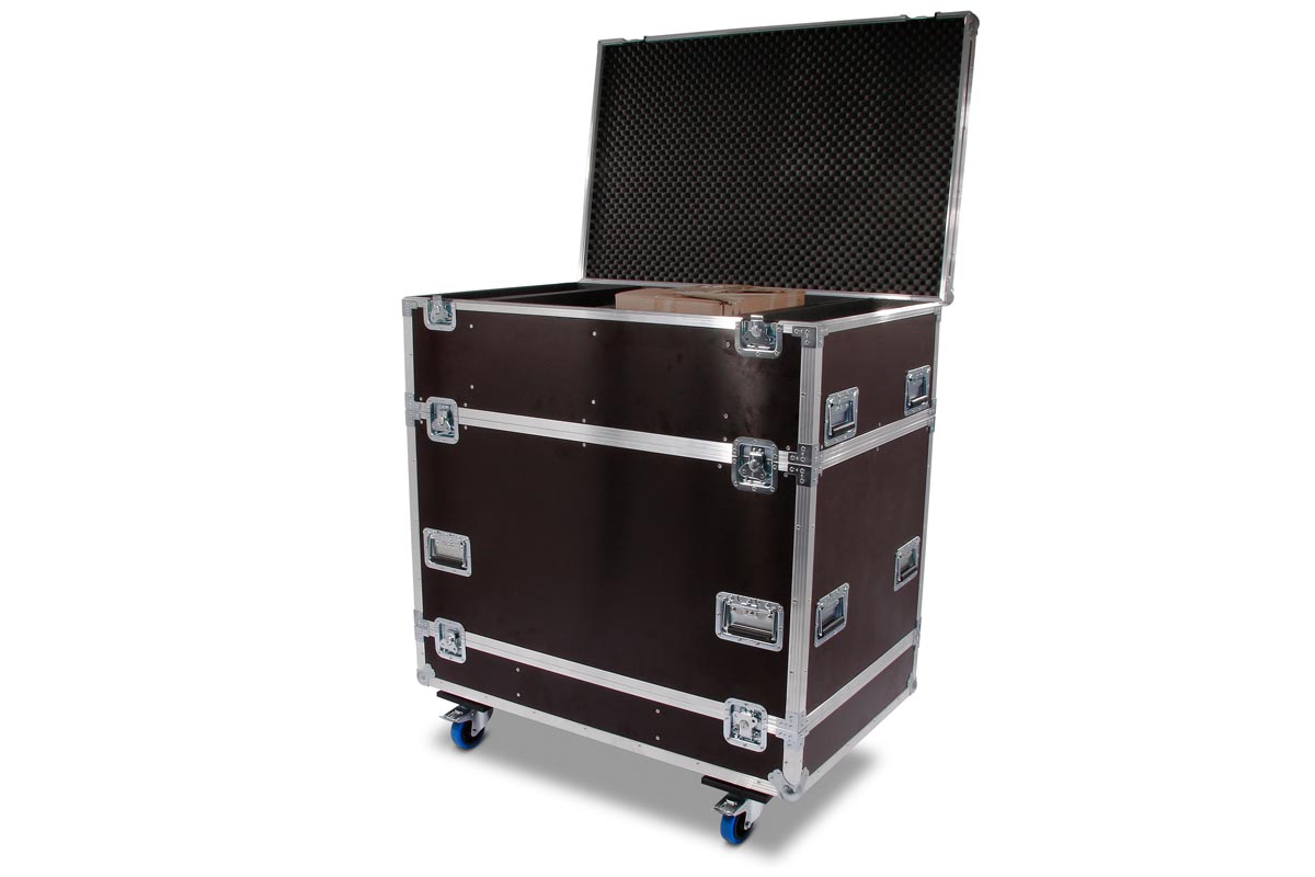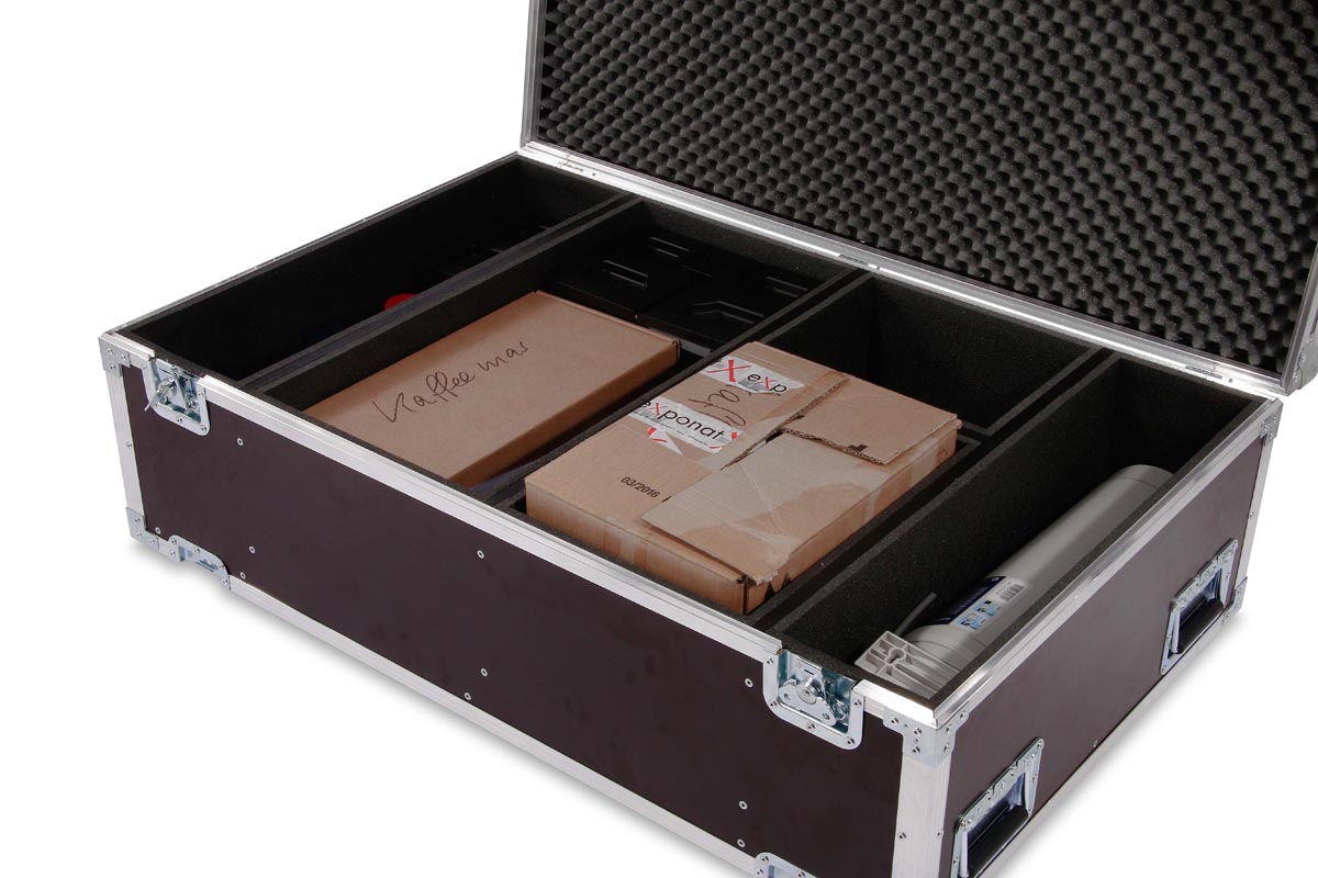 Hauben Transportcase für eine Franke Kaffemaschine. Die Haube ist zweigeteilt und hat im obersten, abnehmbarem Element, eine Truhe mit 5 Fächern für Zubehör integriert.