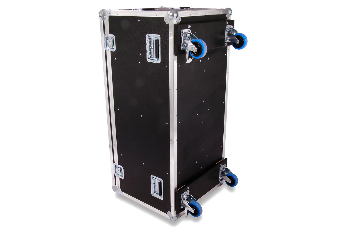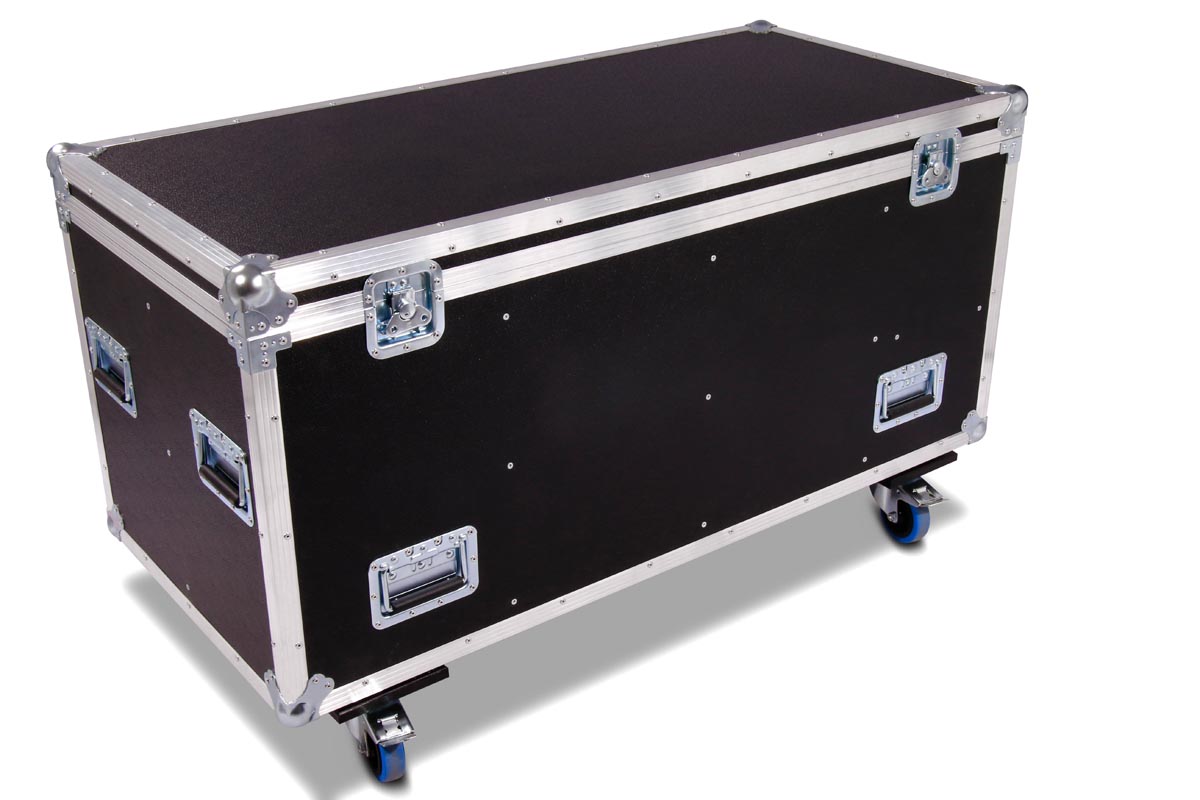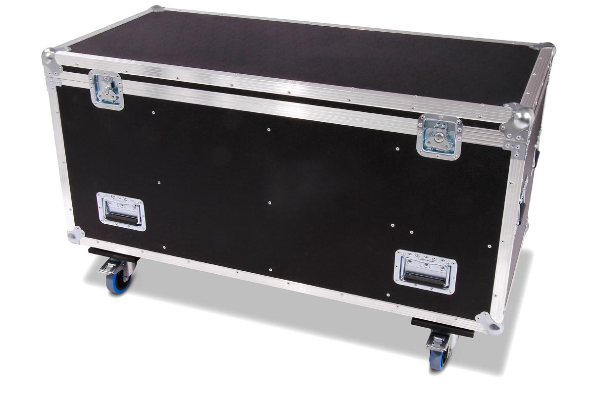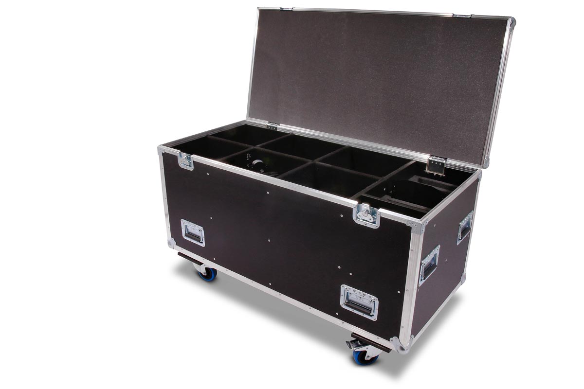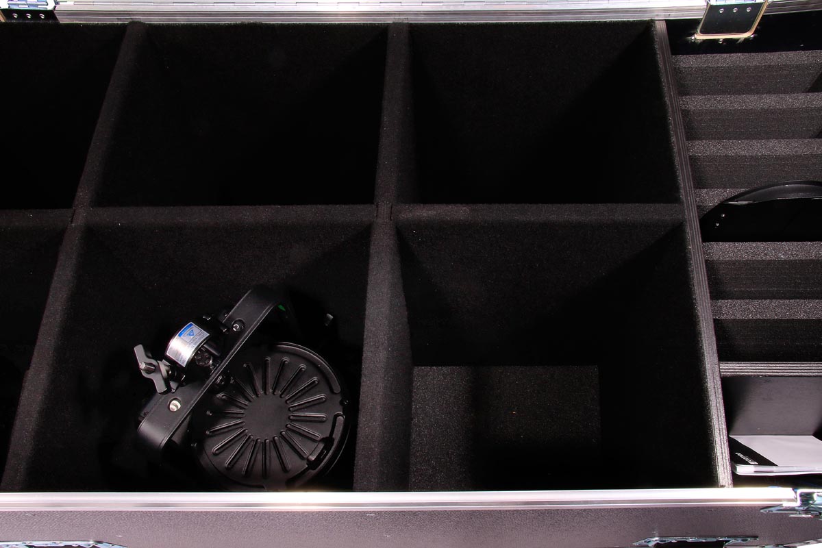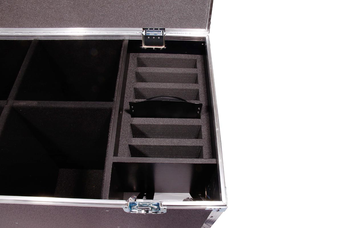 Truhen Transportcase Ausführung #Profi für 6 LED Theater Spots von Cameo mit seitlichen Fächern und Schaumstoffinlay für Torblenden und ungepolsterten Fach für Kabel.