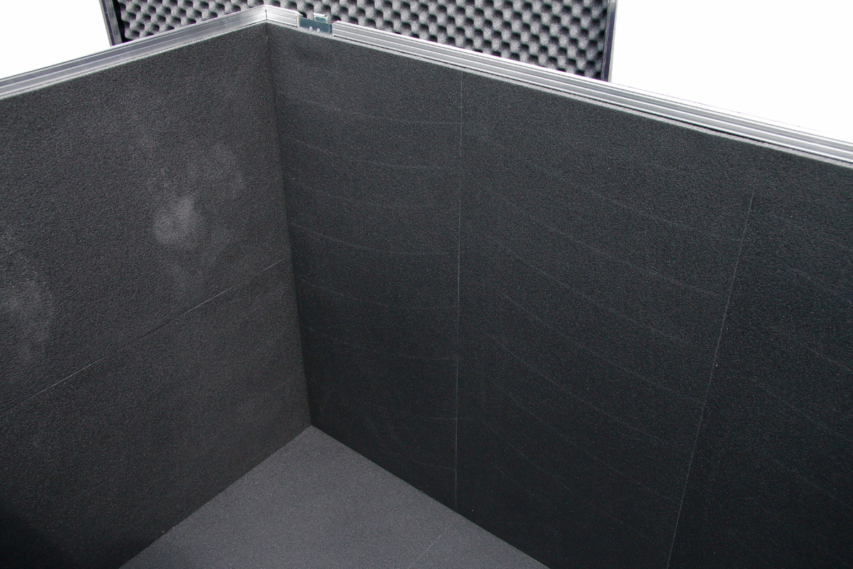 Truhe mit Schaumstofpolster im gesamten Innenbereich und vier Lenkrollen.