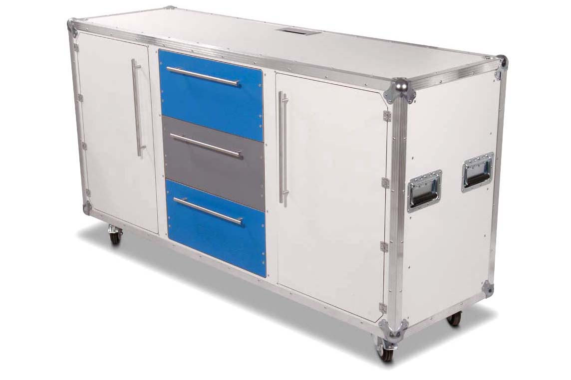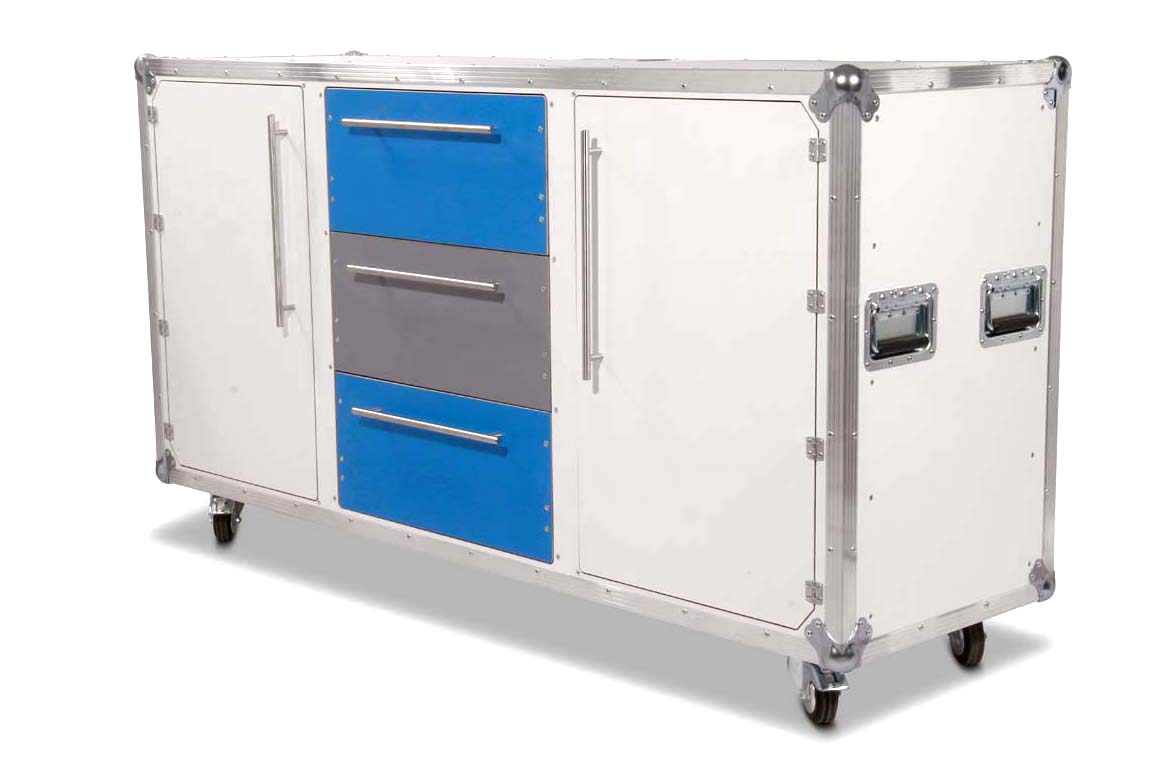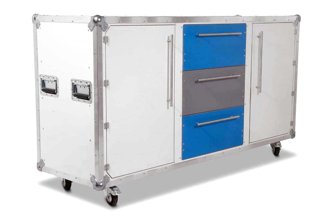 Sideboard in weiß mit 3 farbigen Schubladen himmelblau/grau