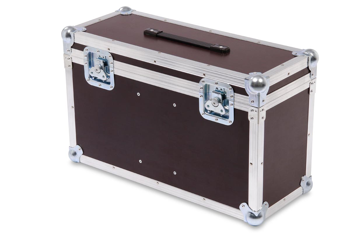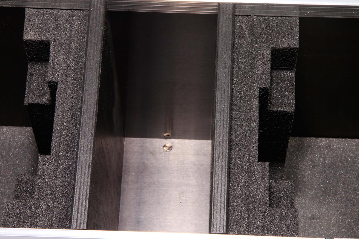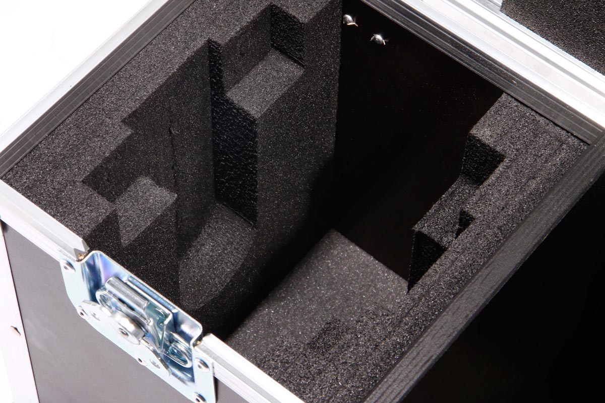 Transport Truhe für zwei Cameo Nano Spot 300. Zwei Kammern enthalten Schaumstoffinlays, die optimal für die Scheinwerfer gefräst wurden. Sie sind sehr einfach zu entnehmen und auch wieder zum einfügen. Ein Zubehörfach nimmt Kabel und Klammern auf.