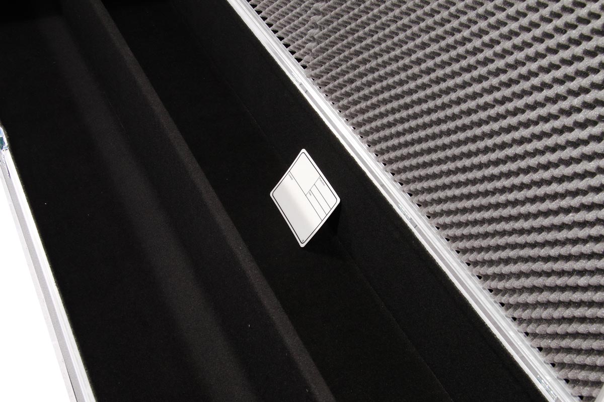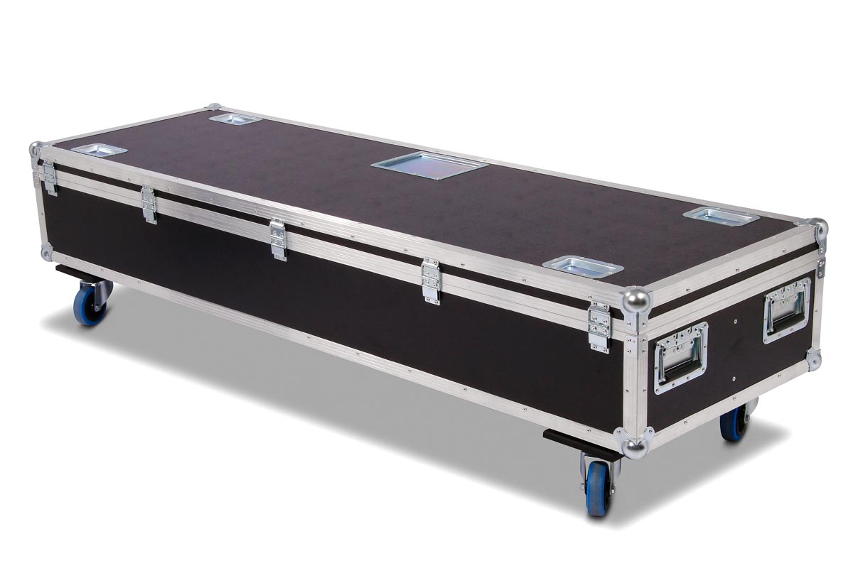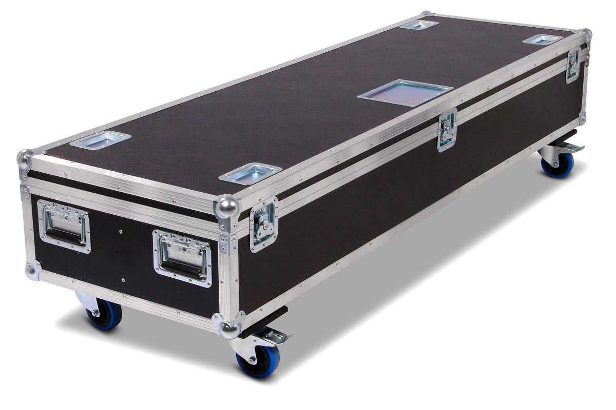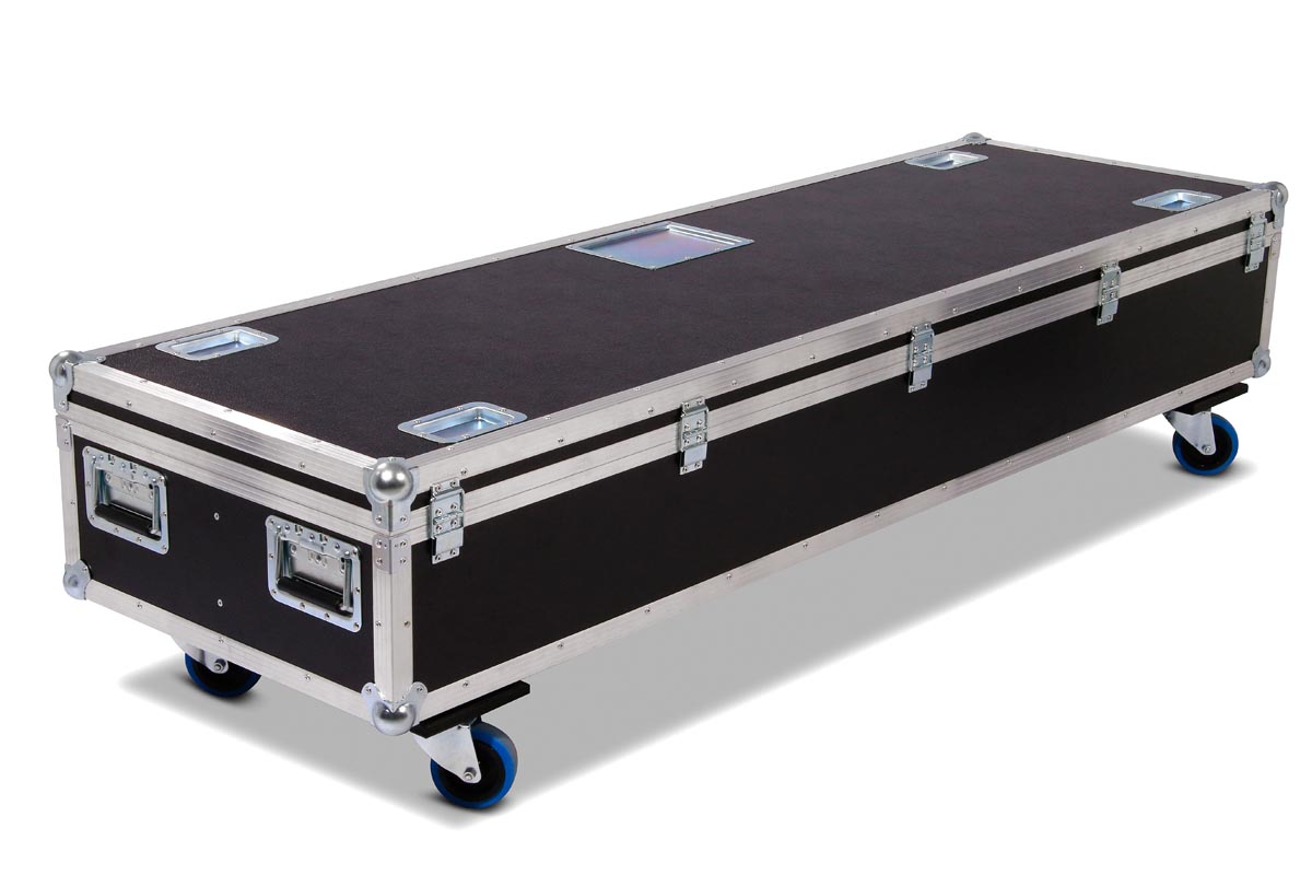 Truhencase auf Rollen für 2 Stück Manfrotto Windup 087 NW. Die Inneneinteilung ist mit Nadelfilz bezogen und durch einen Mittelsteg gut voneinander getrennt. Im Deckel ist Noppenschaum verbaut.