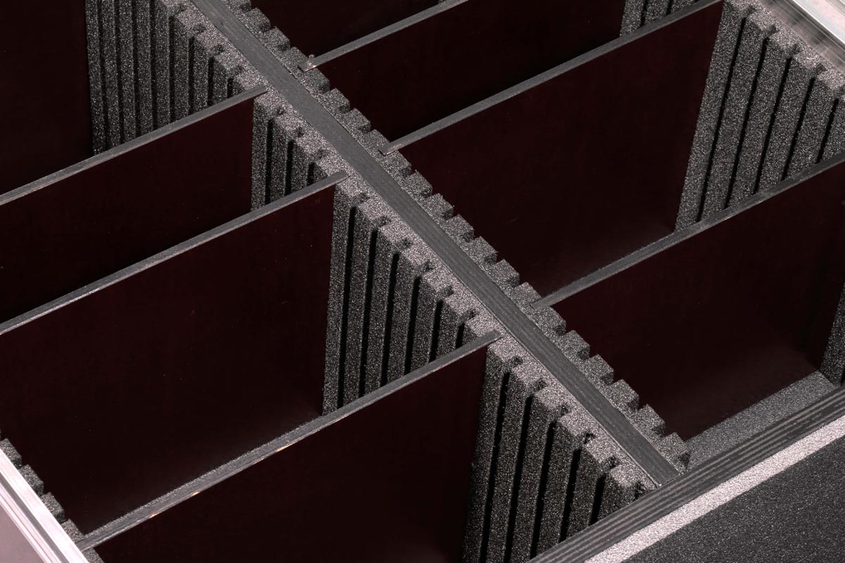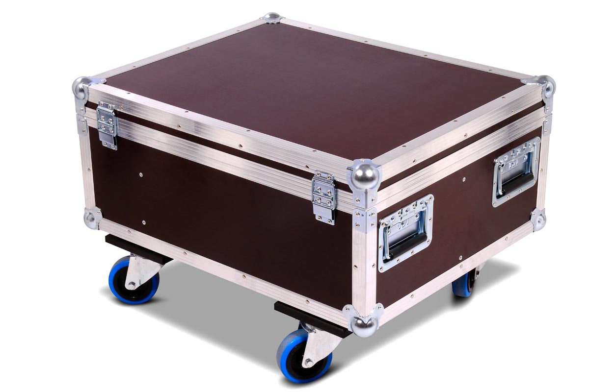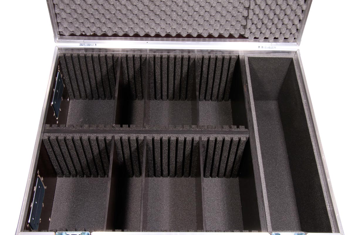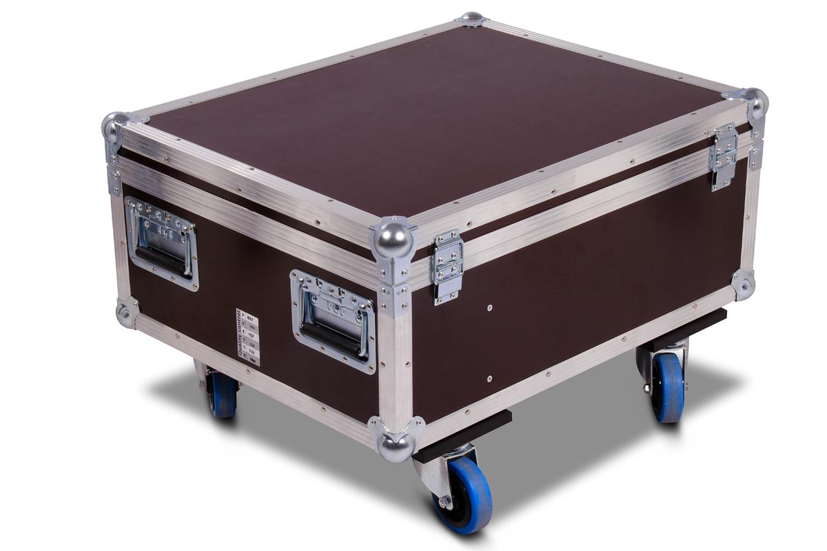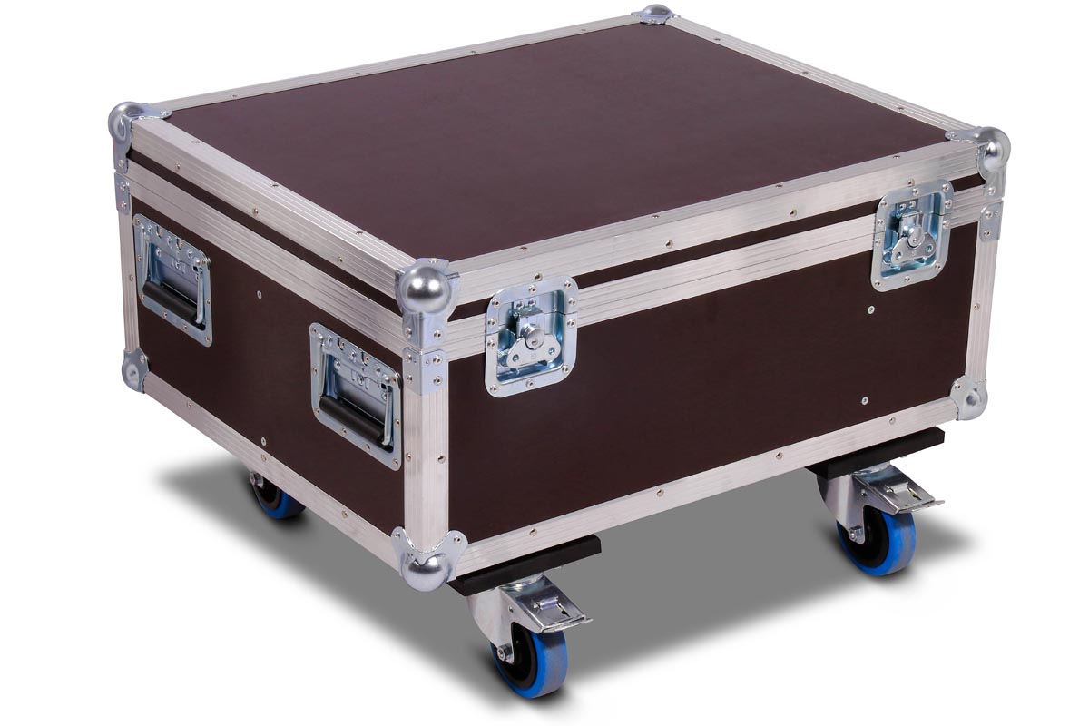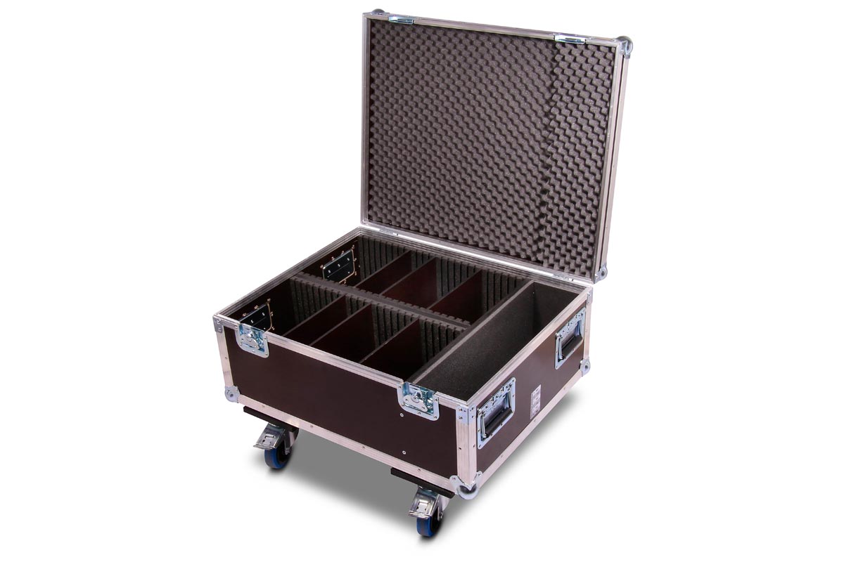 Truhe mit aufklappbarem Deckel für 8 Stück Stairville Tri Flat PAR Profile 5x3W und Zusatzfach.