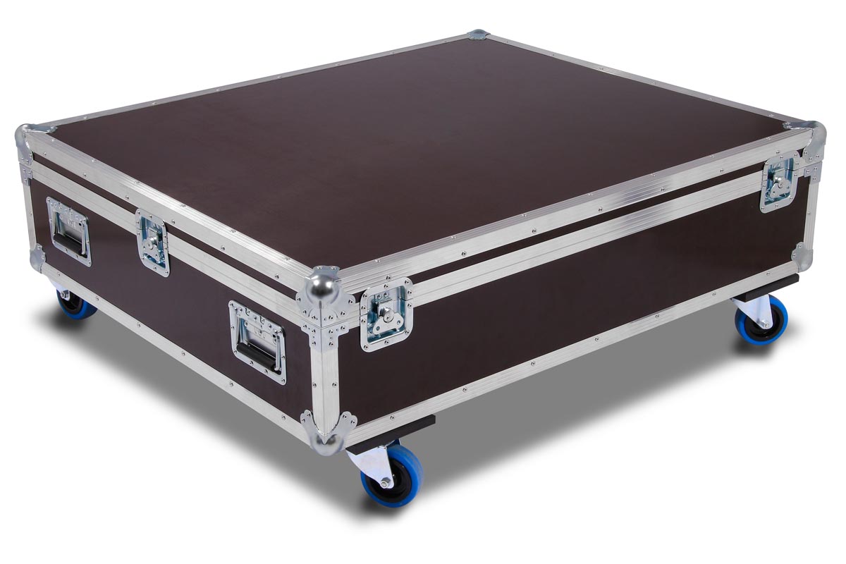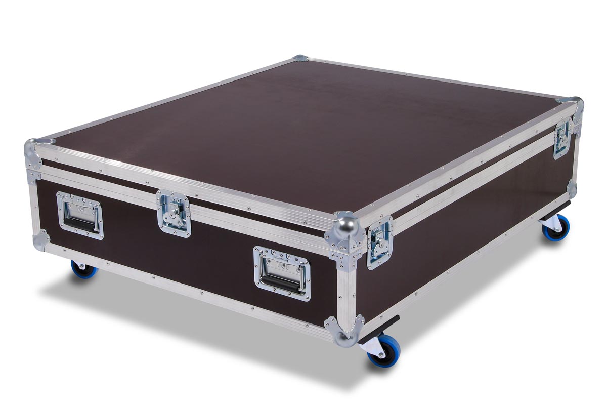 Truhe für den Transport mit Lenkrollen von denen zwei mit Bremsen versehen sind.