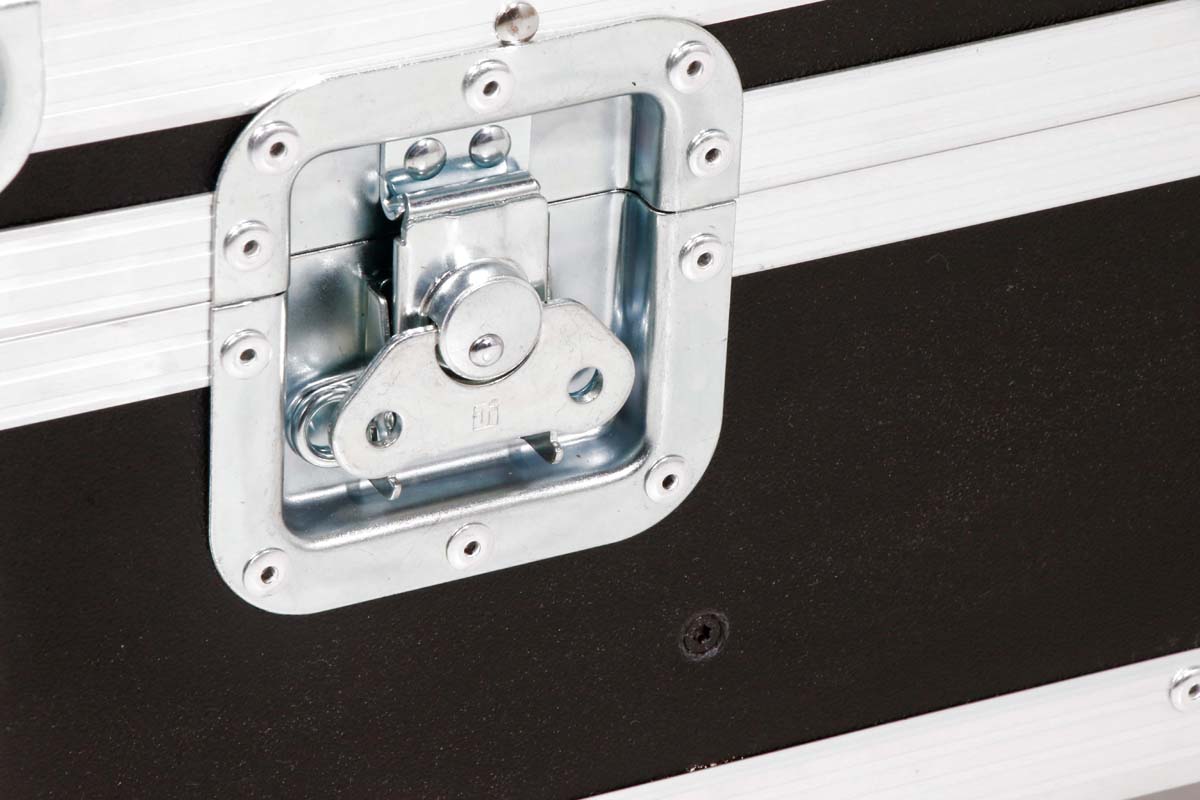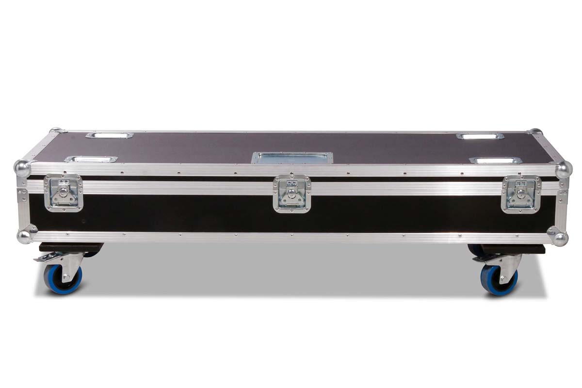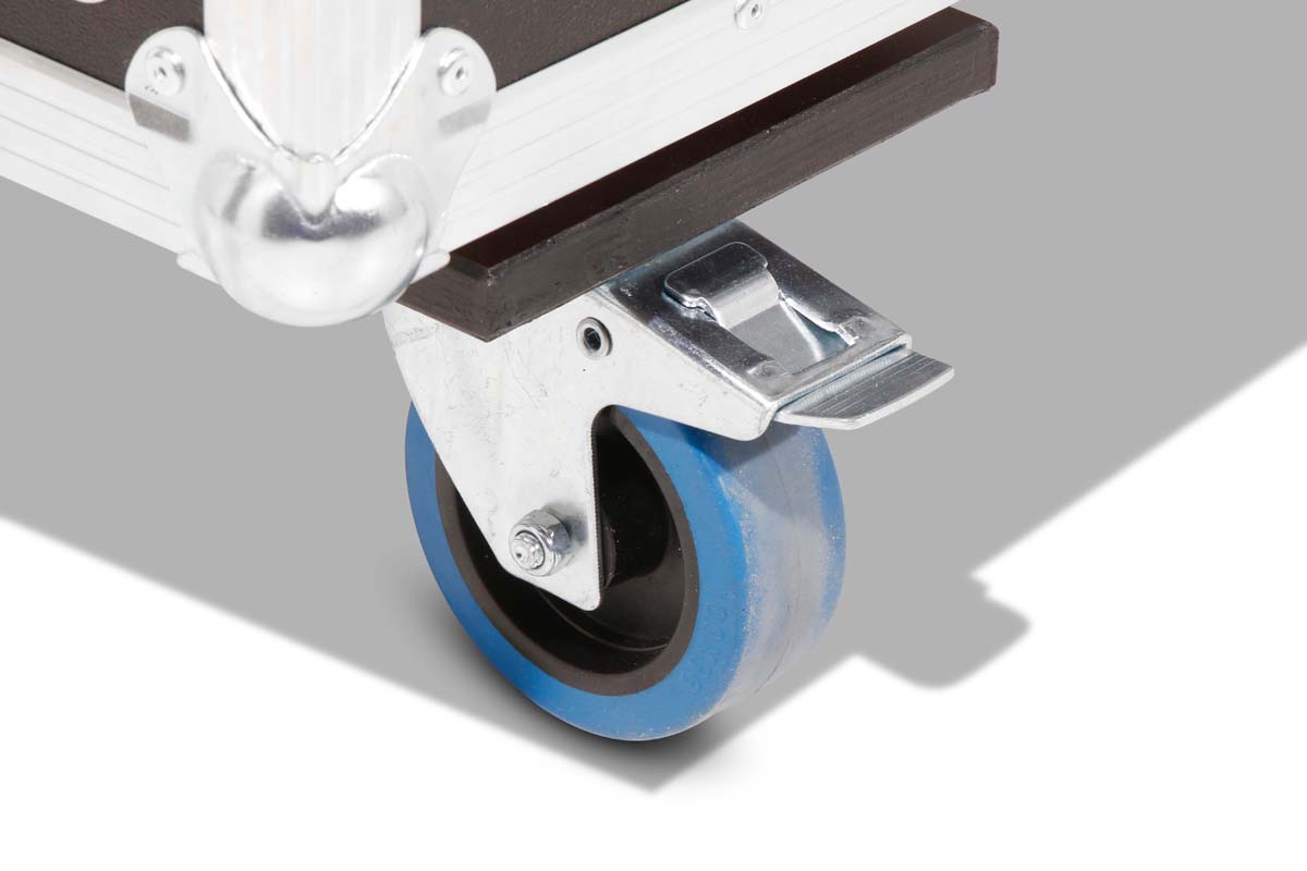 Robustes Truhencase aus schwarzem Polyboard, ausgestattet mit 4 Lenkrollen, davon 2 gebremst.