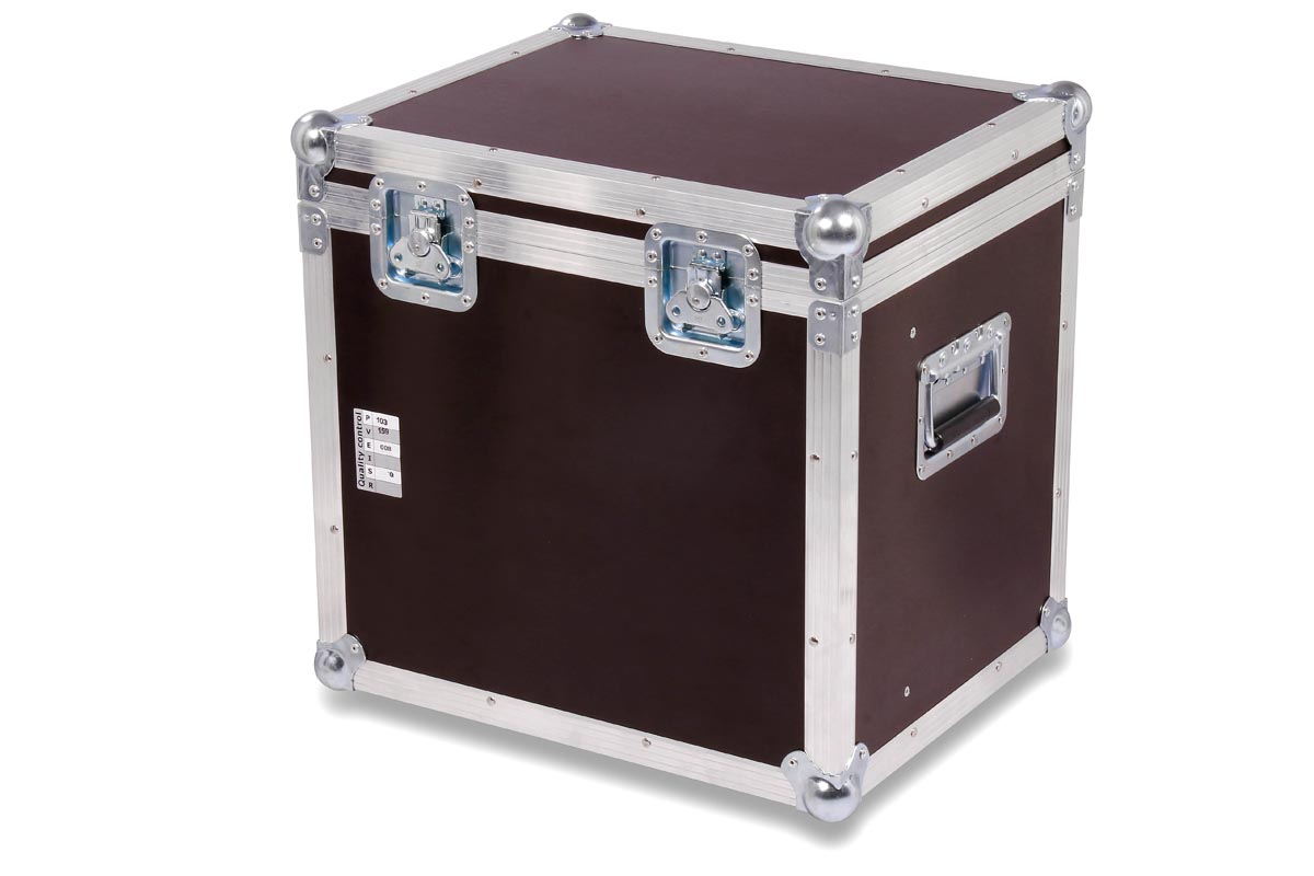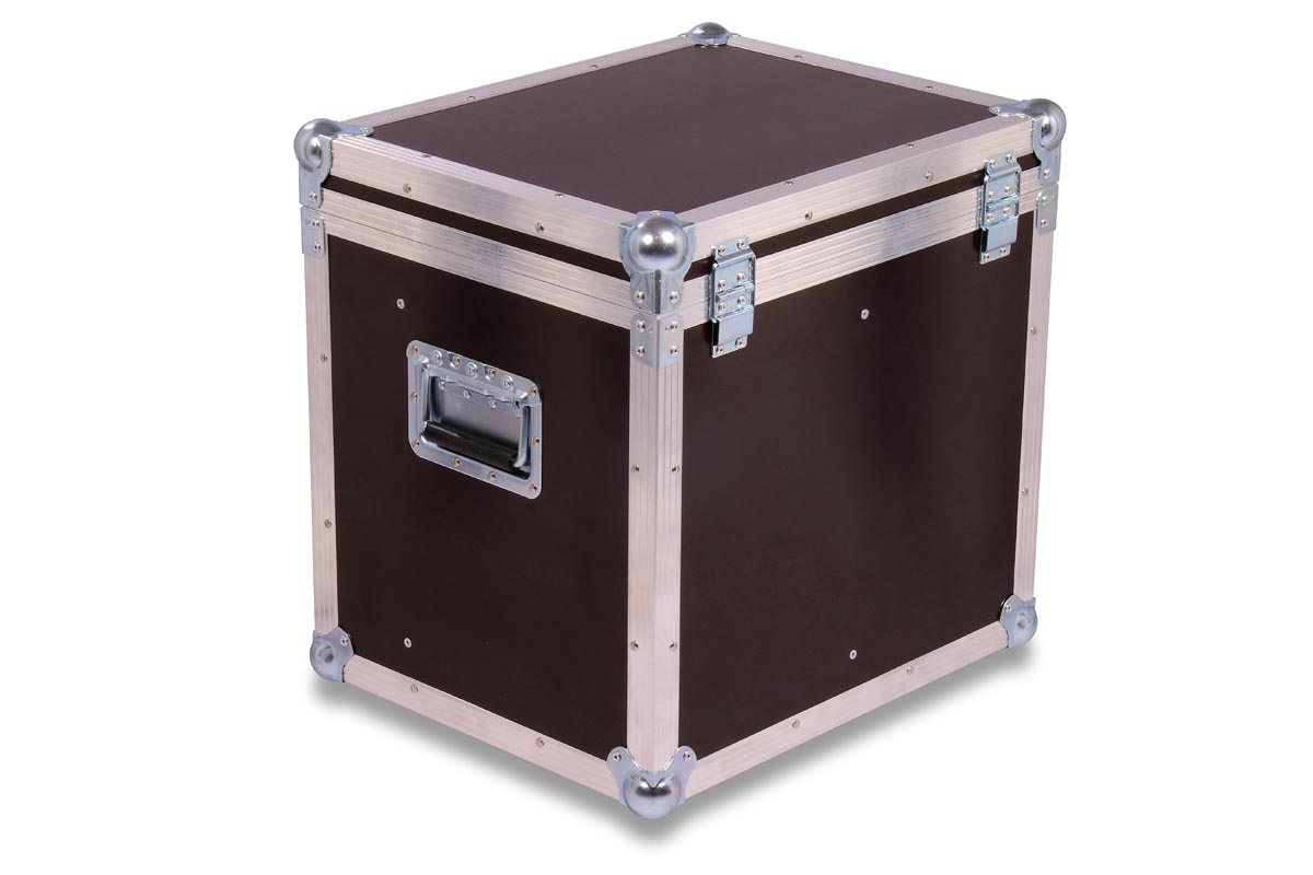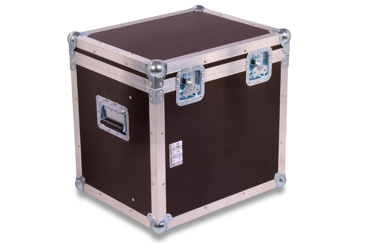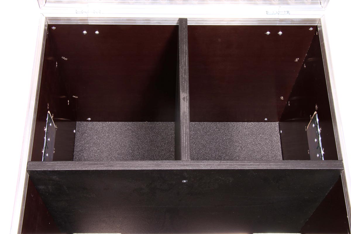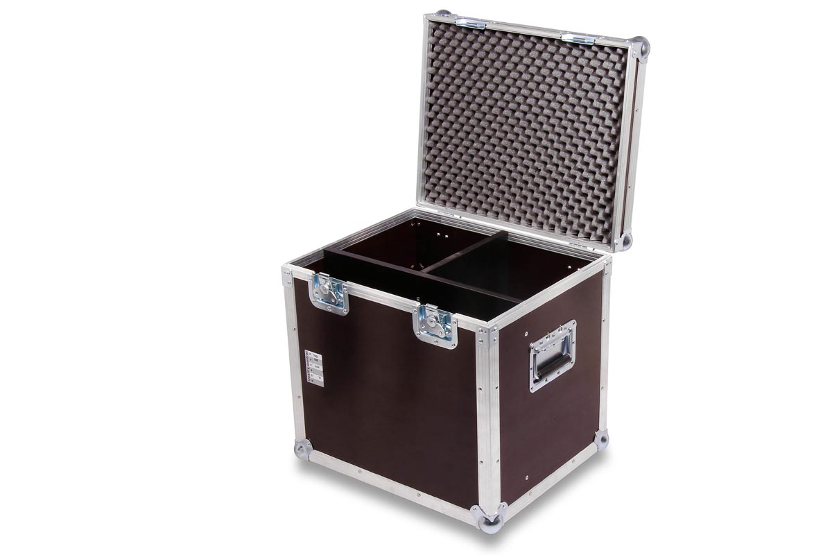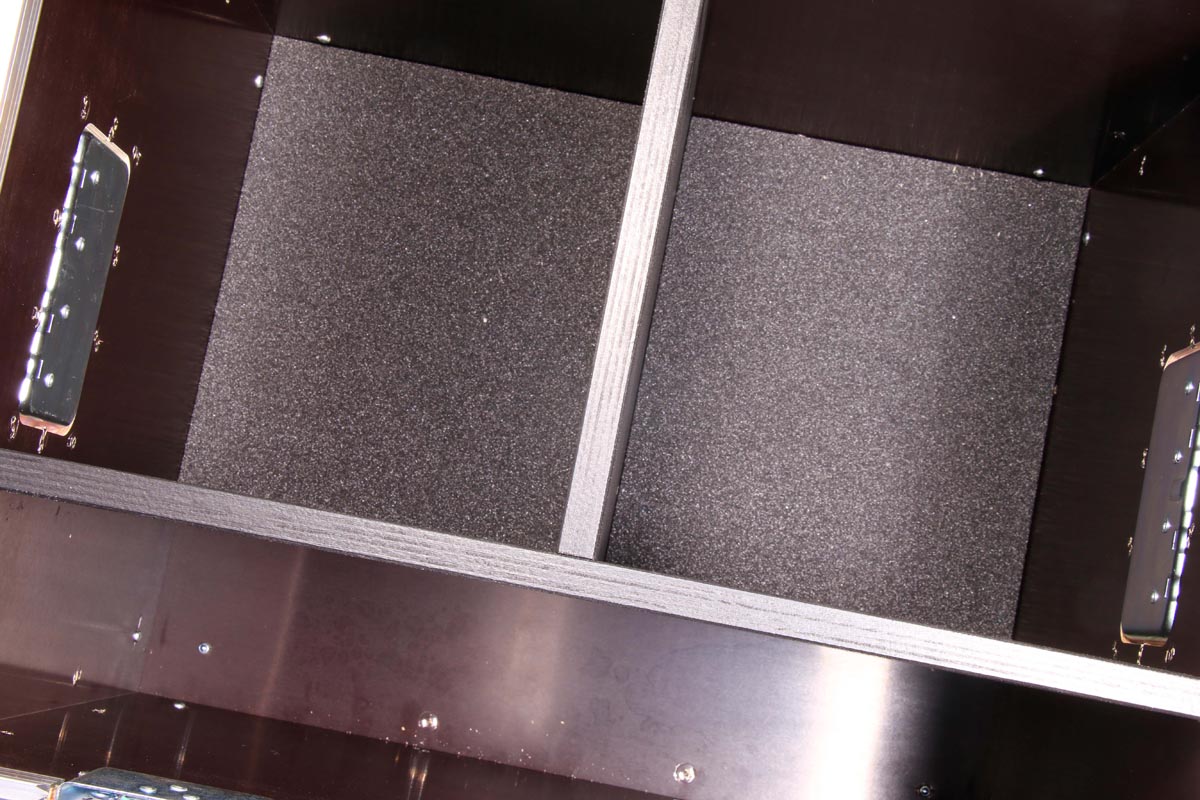 Truhencase in schwarz mit Schaumstoffpolsterung auf Boden und Deckelfläche und Fachunterteilung