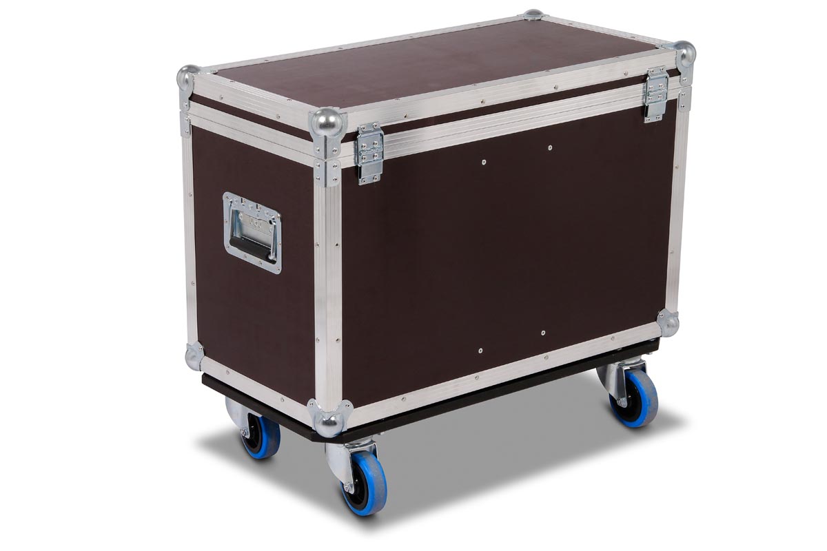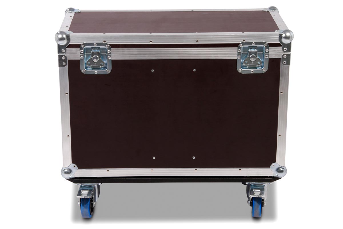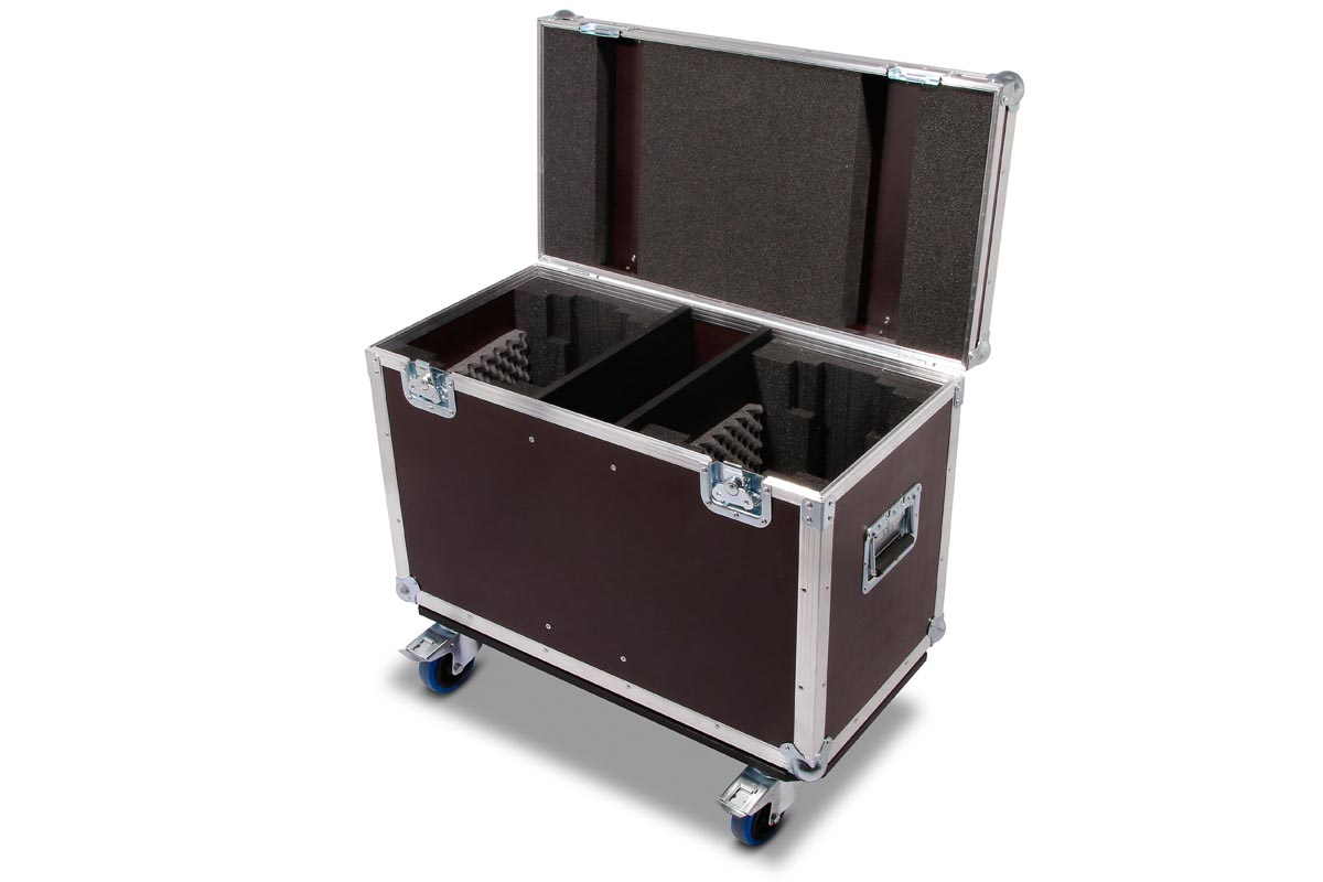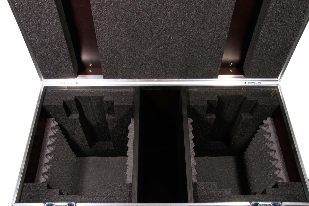 Transport Truhe für zwei Stück Pixel Beam 160. Zwischen den beiden Kammern (Schaumstoff gepolstert) befindet sich ein Fach für Klammern und Kabel.