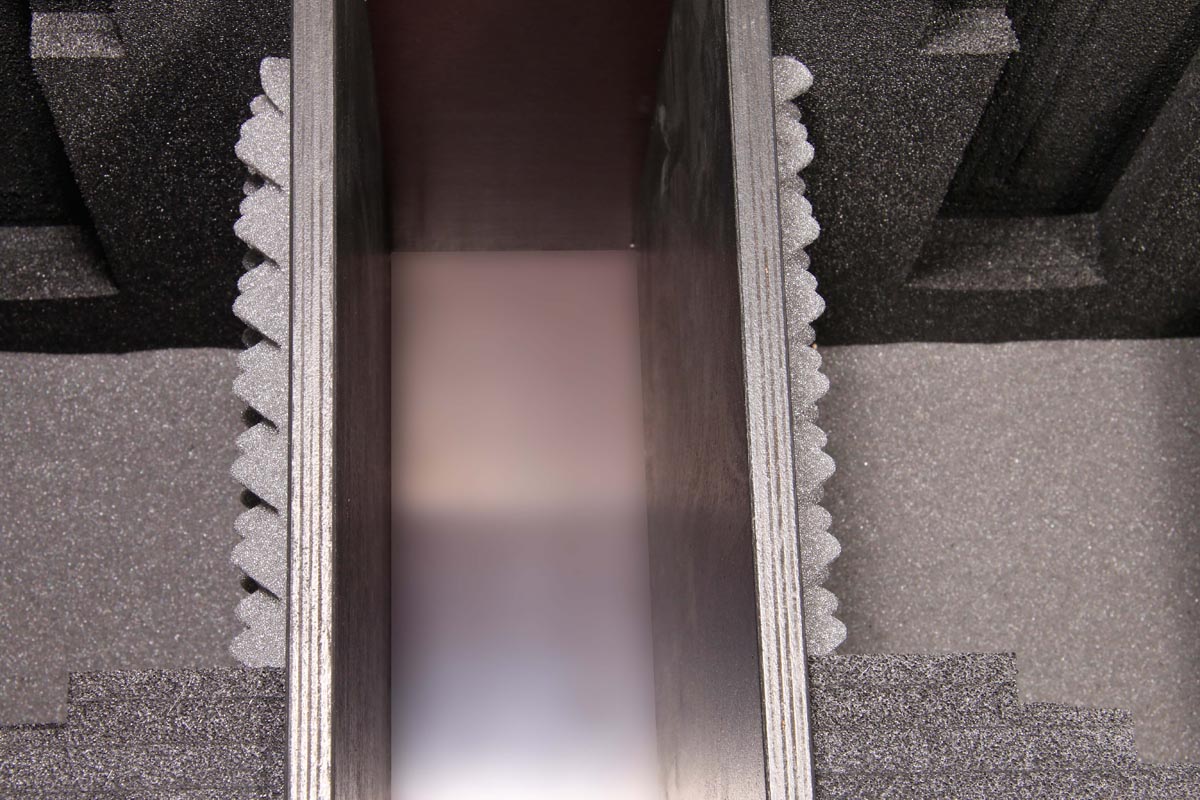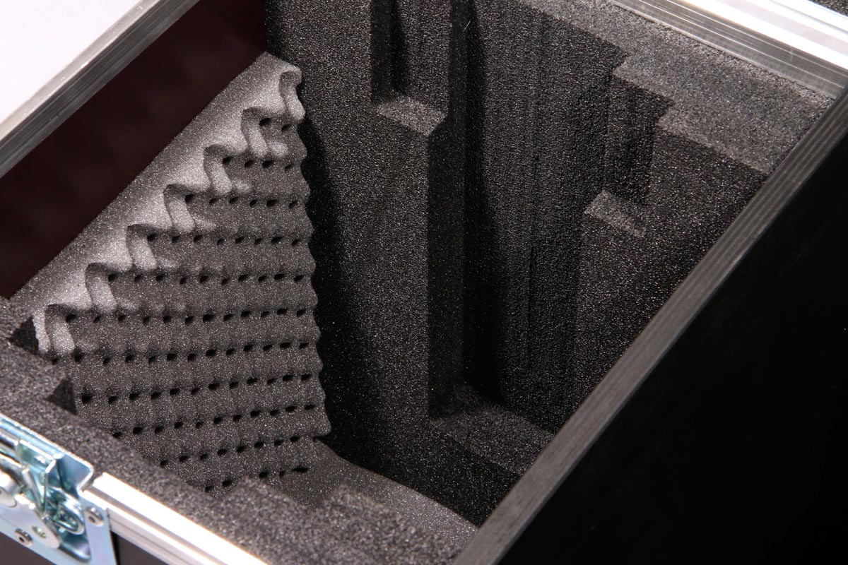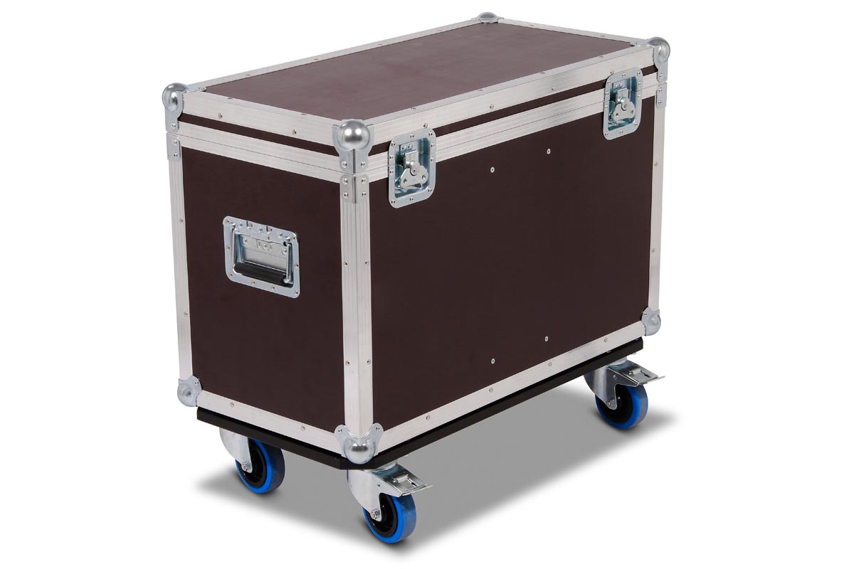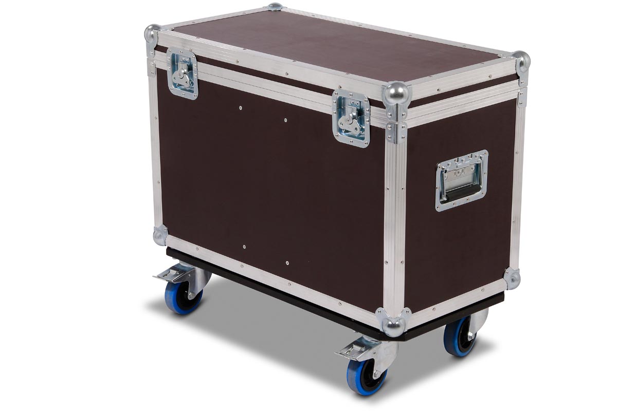 Transport Truhe für zwei Stück Pixel Beam 160. Zwischen den beiden Kammern (Schaumstoff gepolstert) befindet sich ein Fach für Klammern und Kabel.