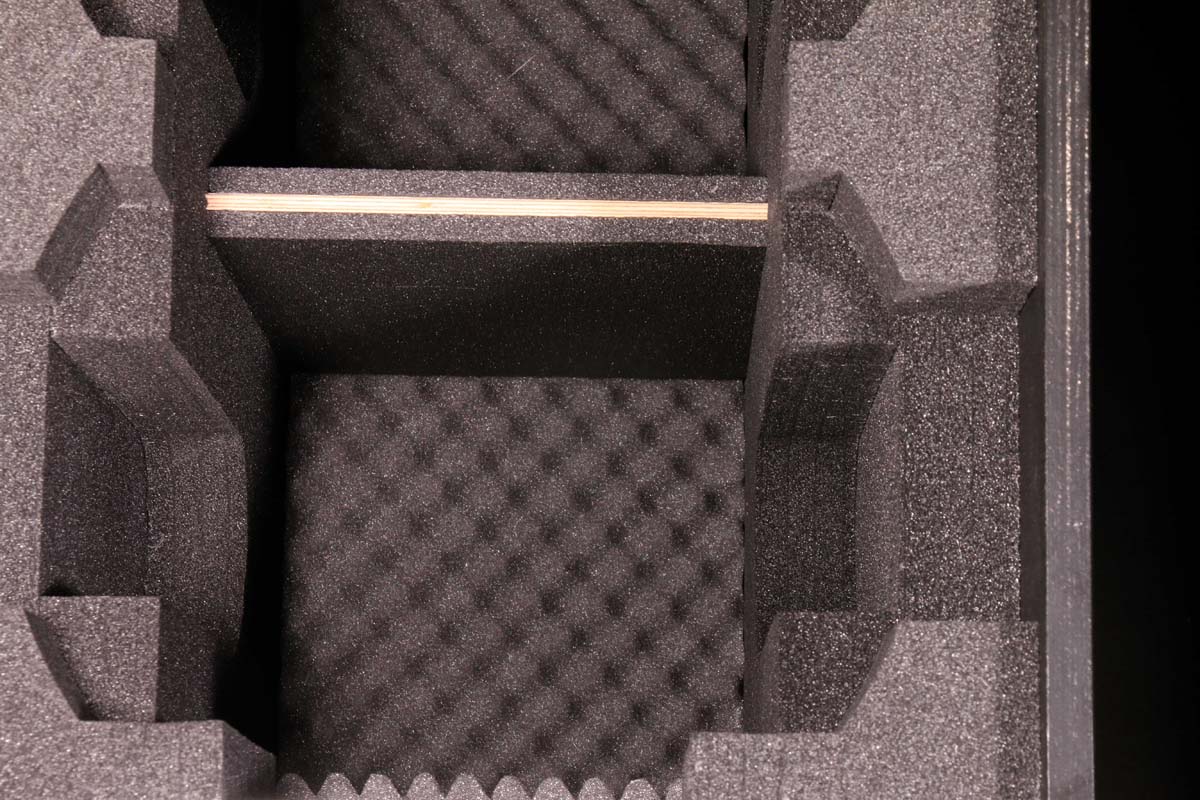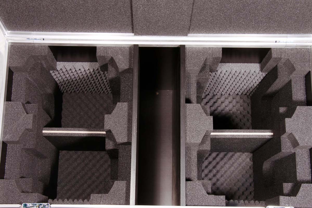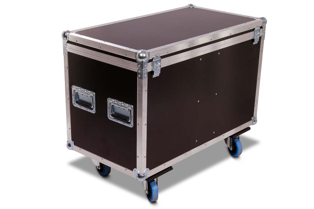 Truhe für 4 Moving Heads von Cameo Auro Spot Z300 mit Zubehörfach und Lenkrollen.