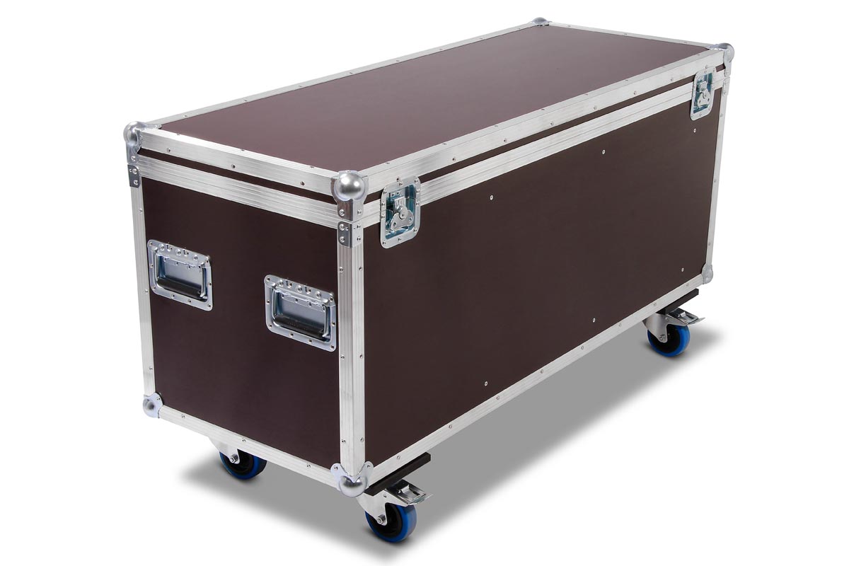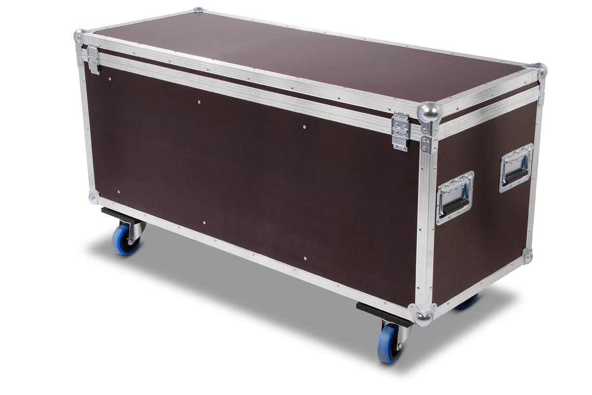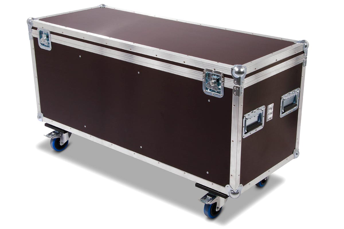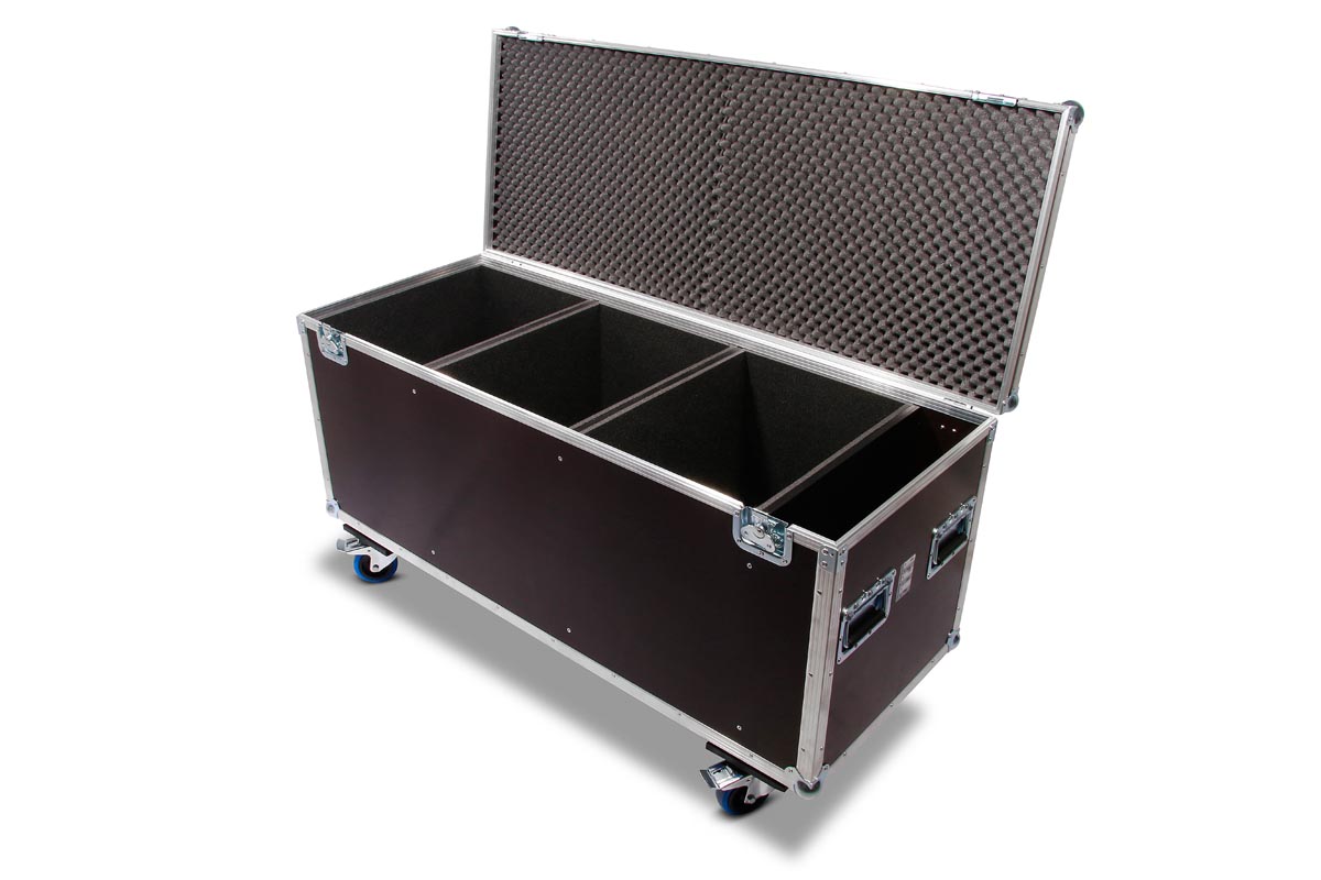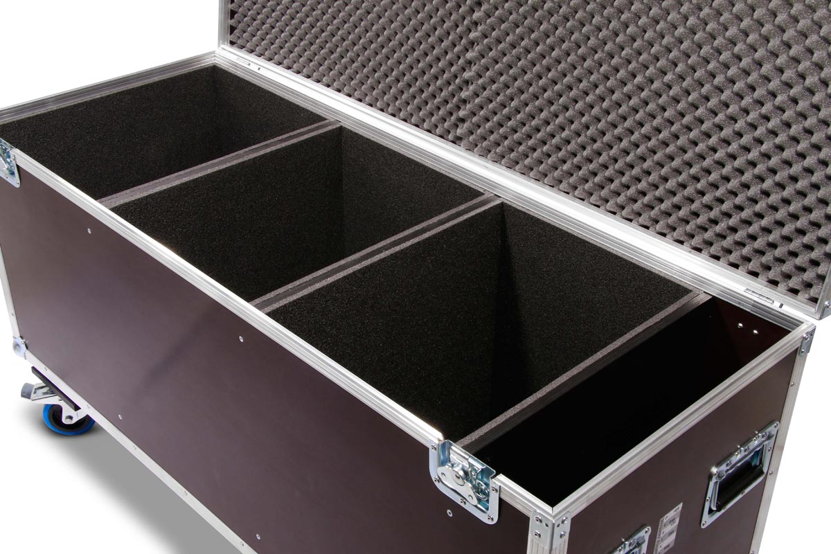 Truhencase auf Rollen für 3x Eurolite THA-250F mit montiertem Global Truss 5073 Selflock Haken.