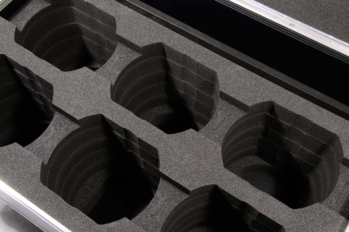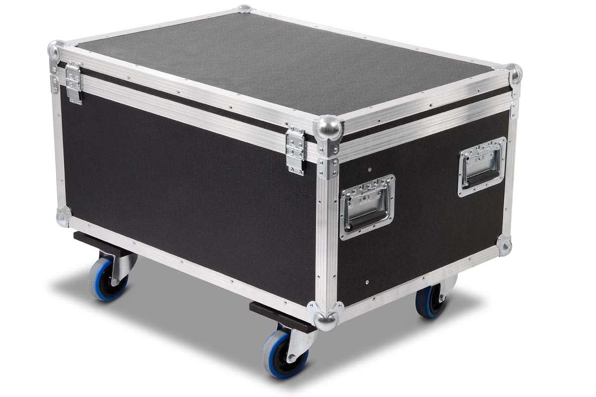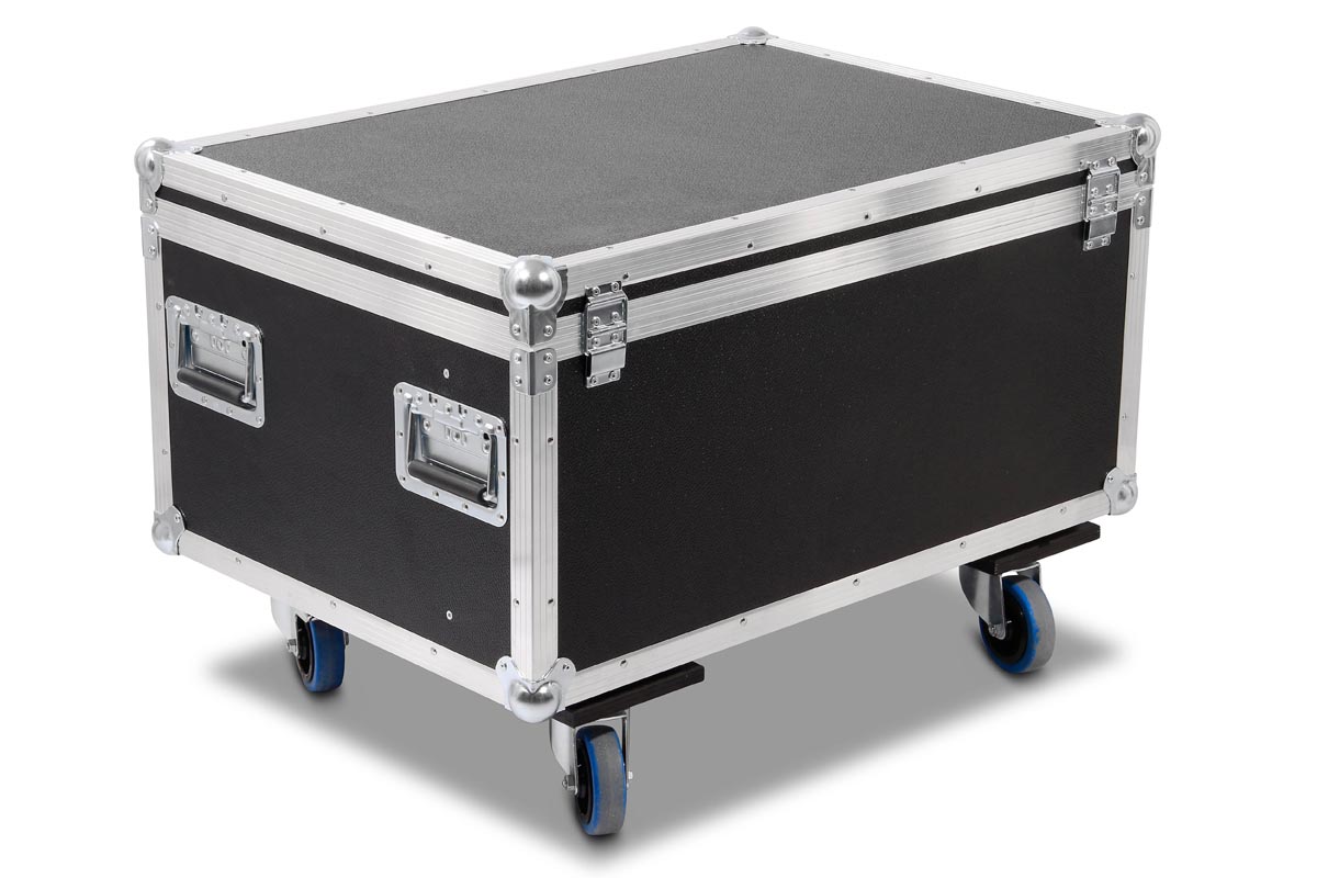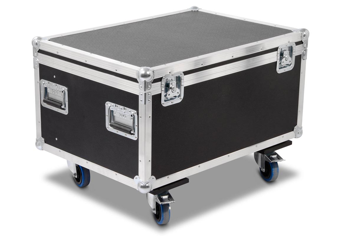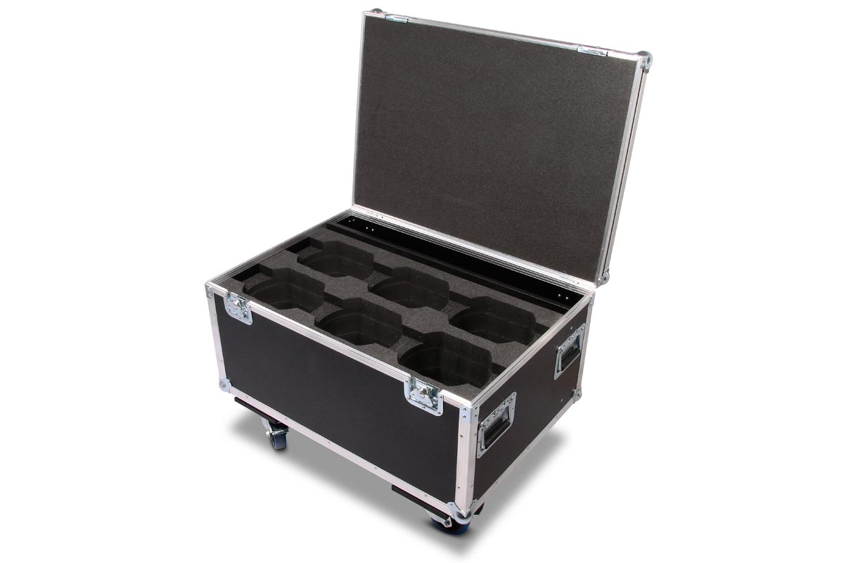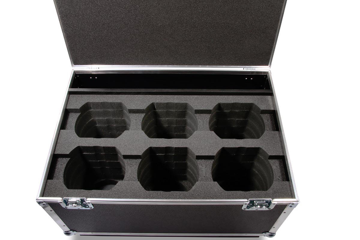 6 Stück der Moving Heads passen in diese Truhe. In Stufenaufbau Technik, werden hier die
