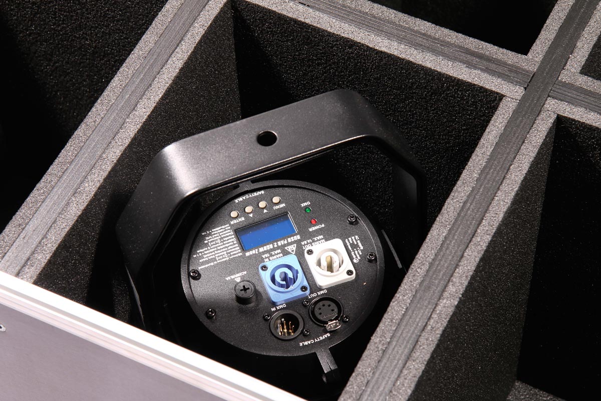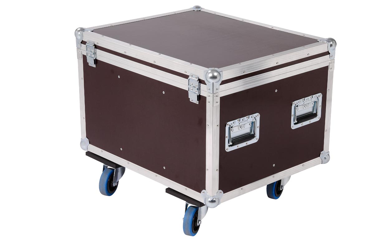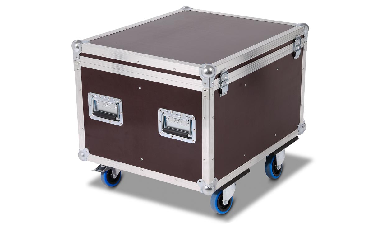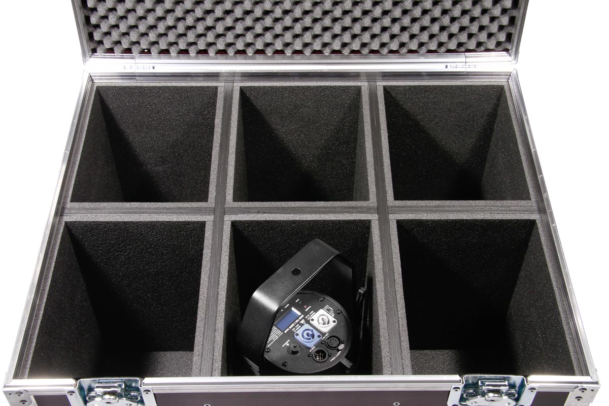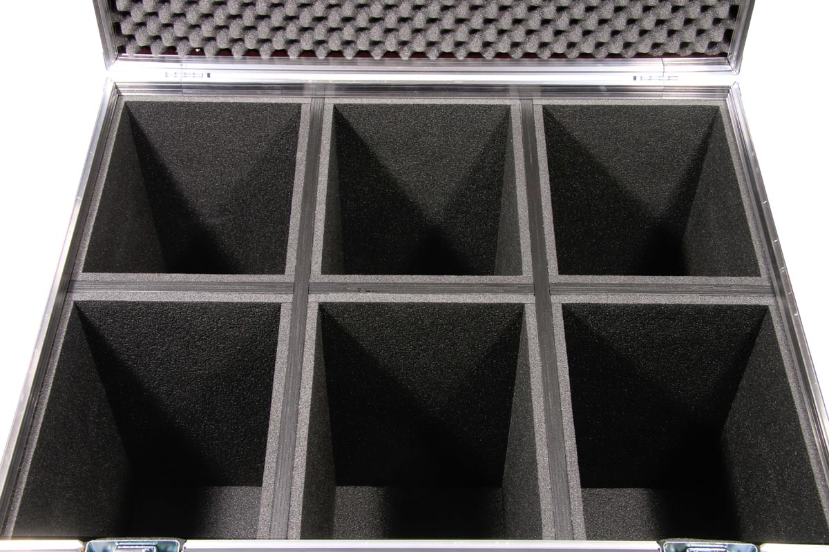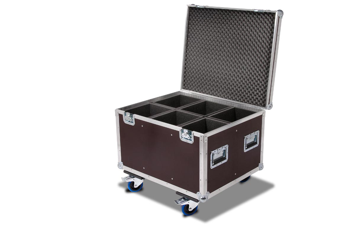 6 Stück der Moving Heads passen in diese Truhe. Die Trennbretter sind mit