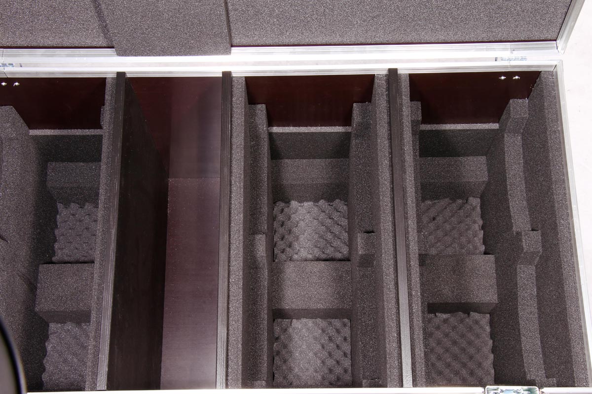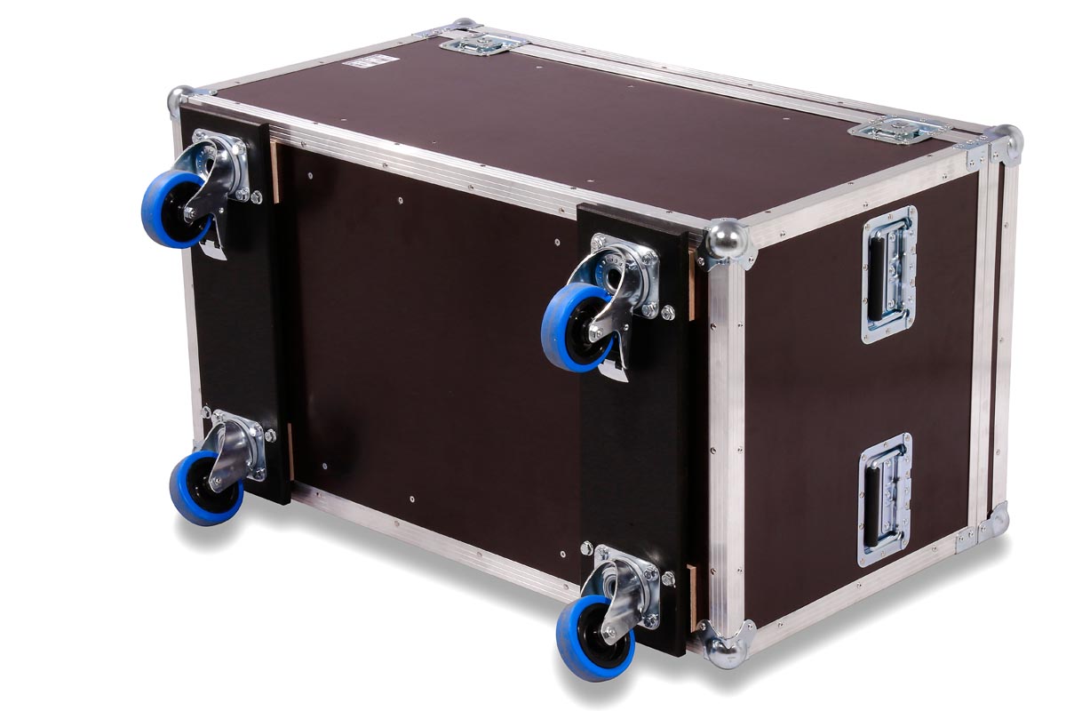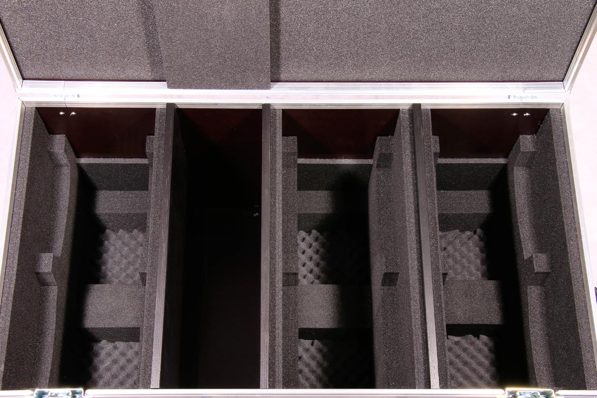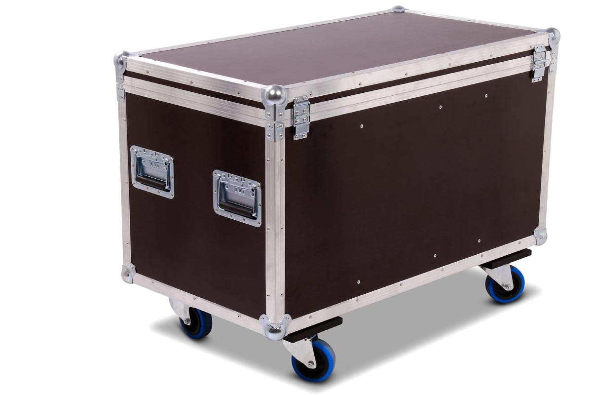 6 Stück des Moving Heads Showtec Phantom 50 LED Spot/Wash passen genau in diese Transport Truhe aus hochwertigen Materialien.
