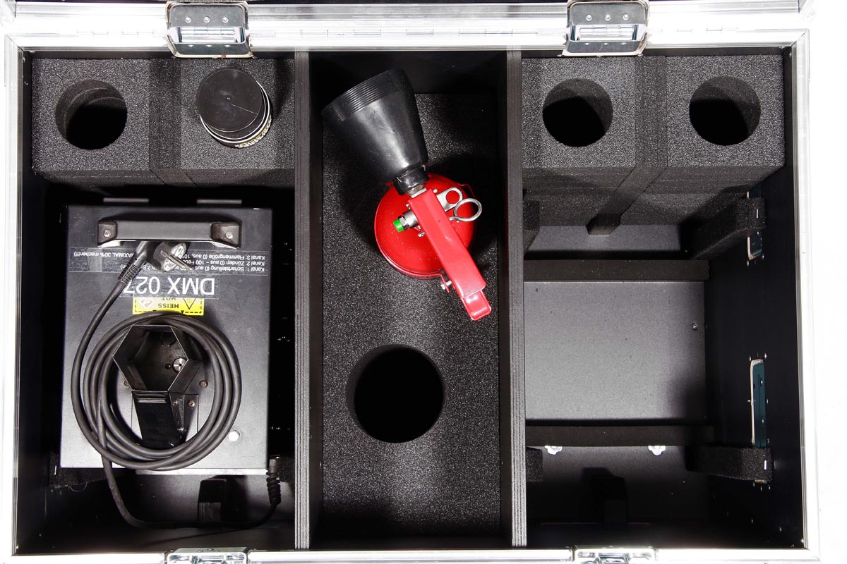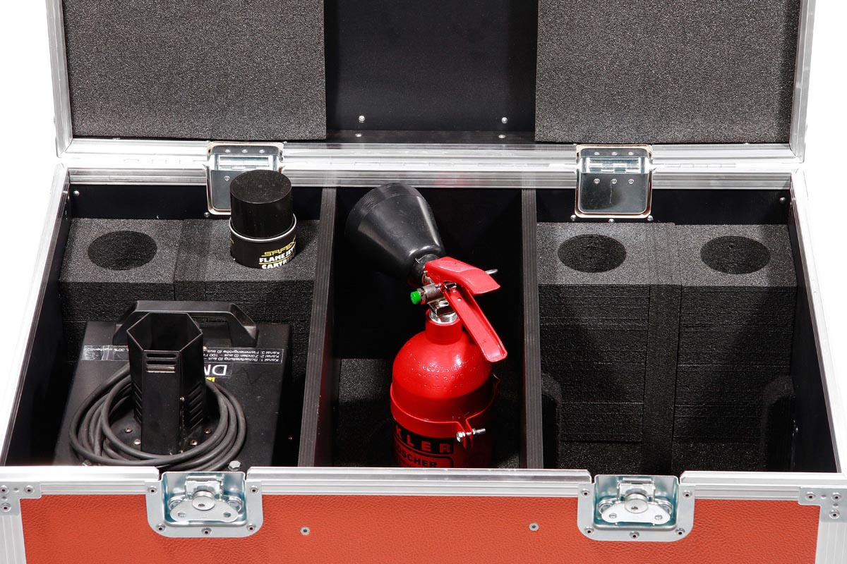 Transporttruhe für 2 Feuerlöscher, 2 Flamejett Flammenprojektor und Aerosolspray.