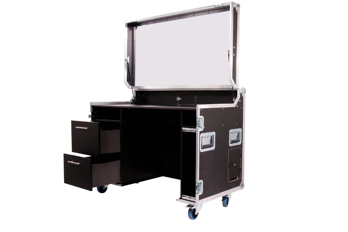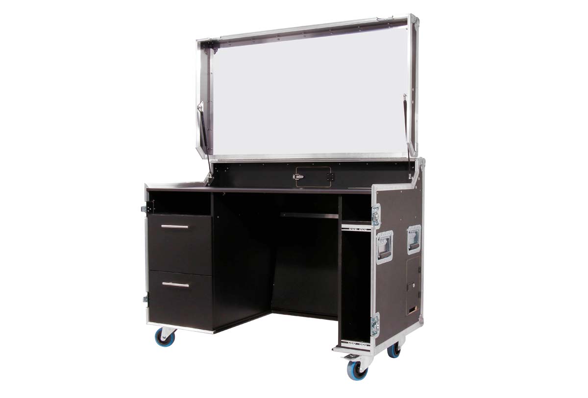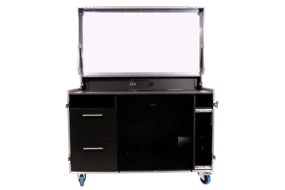 Mobiler Arbeitsplatz mit Deckel aus Polycarbonat , der auch als Spuckschutz dient, darunter eine Durchreiche mit Klappe,